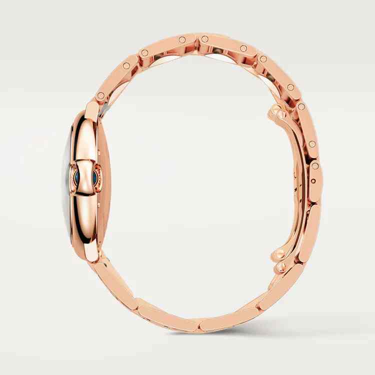 Ballon Bleu de Cartier watch, 36 mm. Self-winding mechanical movement. Rose gold 750/1000 case and fluted crown in rose gold 750/1000 set with a sapphire cabochon. Matt silvered stamped sunray dial set with 21 brilliant-cut diamonds totaling 0.19 carats. Blued-steel sword-shaped hands. Sapphire crystal. Interchangeable bracelet in rose gold 750/1000. Thickness: 0.47”. Water-resistant up to 3 bar (approx. 30 meters/100 feet).