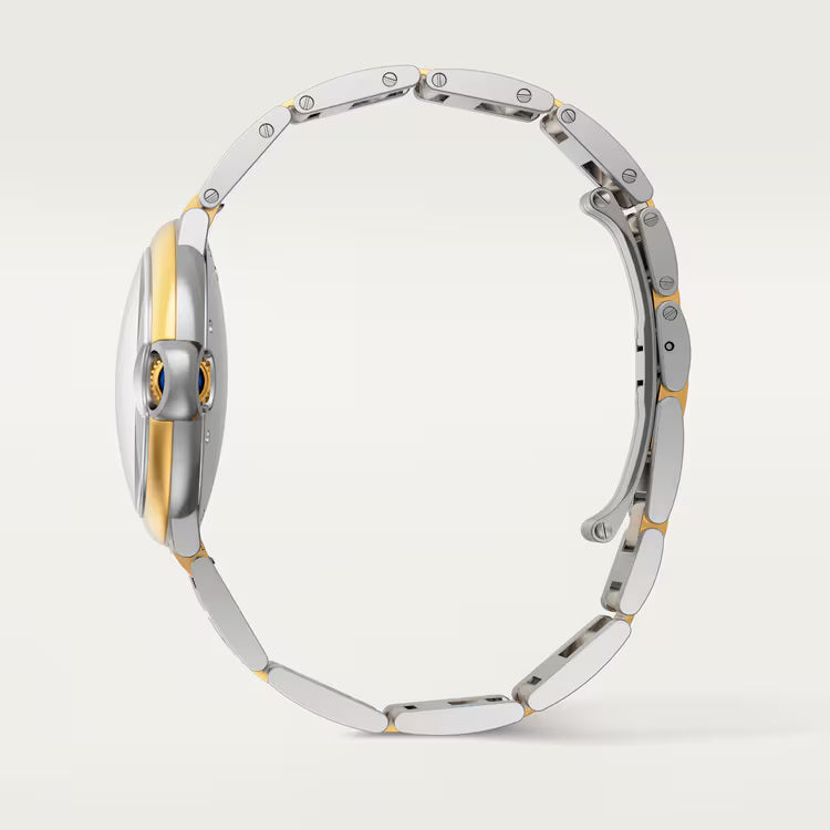 Ballon Bleu de Cartier watch, 36 mm. Mechanical movement with automatic winding. Steel case, fluted 18K yellow gold (750/1000) crown set with a synthetic cabochon-shaped spinel. Silvered guilloché dial. Blued-steel sword-shaped hands. Sapphire crystal. Interchangeable two-tone strap. Thickness: 12.1 mm. Water-resistant up to 3 bar (approx. 30 meters/100 feet).