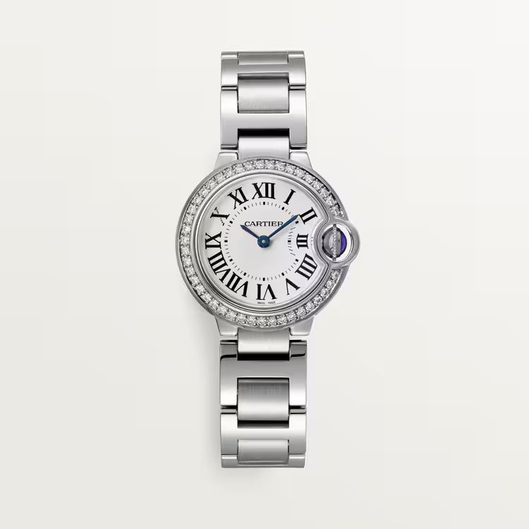 Ballon Bleu de Cartier watch, 28 mm, quartz movement. Steel case, fluted steel crown set with a synthetic cabochon-shaped spinel. Steel bezel set with 42 diamonds totaling 0.48 carats. Opaline dial. Blued-steel sword-shaped hands. Sapphire crystal. Interchangeable steel bracelet, wrist size 6.5”. Thickness: 0.35”. Water-resistant to 3 bar (approx. 30 meters/100 feet). Please note that the carat weight, number of stones and product dimensions will vary based on the size of the creation you order. For detailed information please contact us.