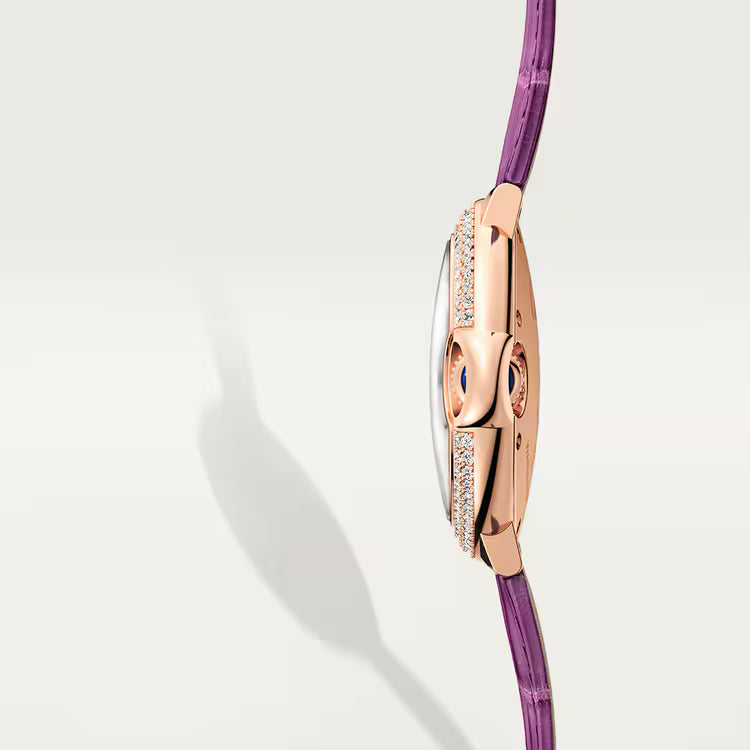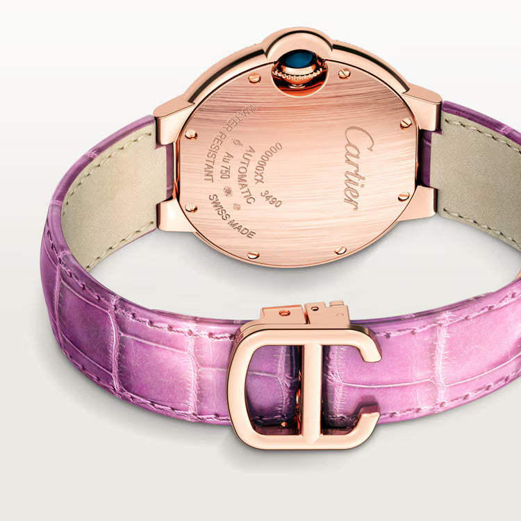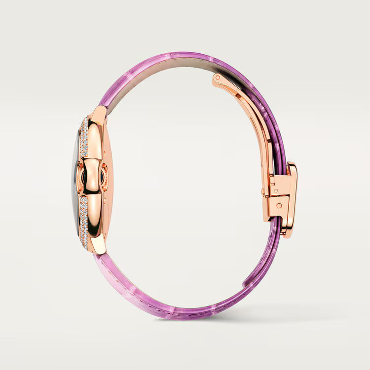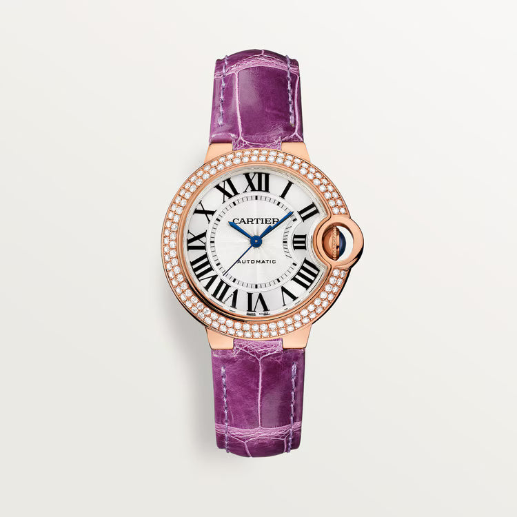 Ballon Bleu de Cartier watch, 33 mm, mechanical movement with automatic winding. Rose gold 750/1000 case set with 115 brilliant-cut diamonds totaling 0.94 carats. Fluted crown set with a sapphire cabochon. Silvered guilloché lacquered opaline dial. Blued-steel sword-shaped hands. Sapphire crystal. Purple patent strap in alligator leather, 14 mm rose gold 750/1000 double adjustable folding buckle. Case dimensions: diameter: 33 mm, thickness: 10.16 mm. Water-resistant up to 3 bar (approx. 30 meters/100 feet).