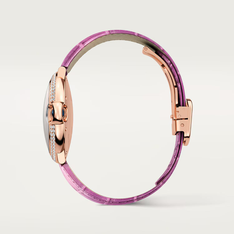 Ballon Bleu de Cartier watch, 36 mm, mechanical movement with automatic winding. Rose gold 750/1000 case set with 123 brilliant-cut diamonds totaling 1.22 carats. Fluted crown set with a cabochon sapphire. Silver guilloché lacquered opaline dial. Blued-steel sword-shaped hands. Sapphire crystal. Purple alligator leather strap, rose gold 750/1000 interchangeable deployant buckle. Case thickness: 12.1 mm. Water-resistant up to 3 bar (approx. 30 meters/100 feet).