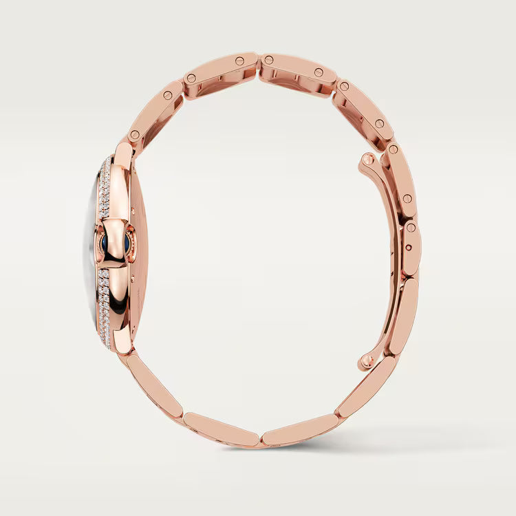 Ballon Bleu de Cartier watch, 36 mm, mechanical movement with automatic winding. Rose gold 750/1000 case set with 123 brilliant-cut diamonds totaling 1.22 carats. Fluted crown set with a cabochon sapphire. Silver guilloché dial. Blued-steel sword-shaped hands. Sapphire crystal. Rose gold 750/1000 interchangeable bracelet. Case thickness: 12.1 mm. Water-resistant up to 3 bar (approx. 30 meters/100 feet).