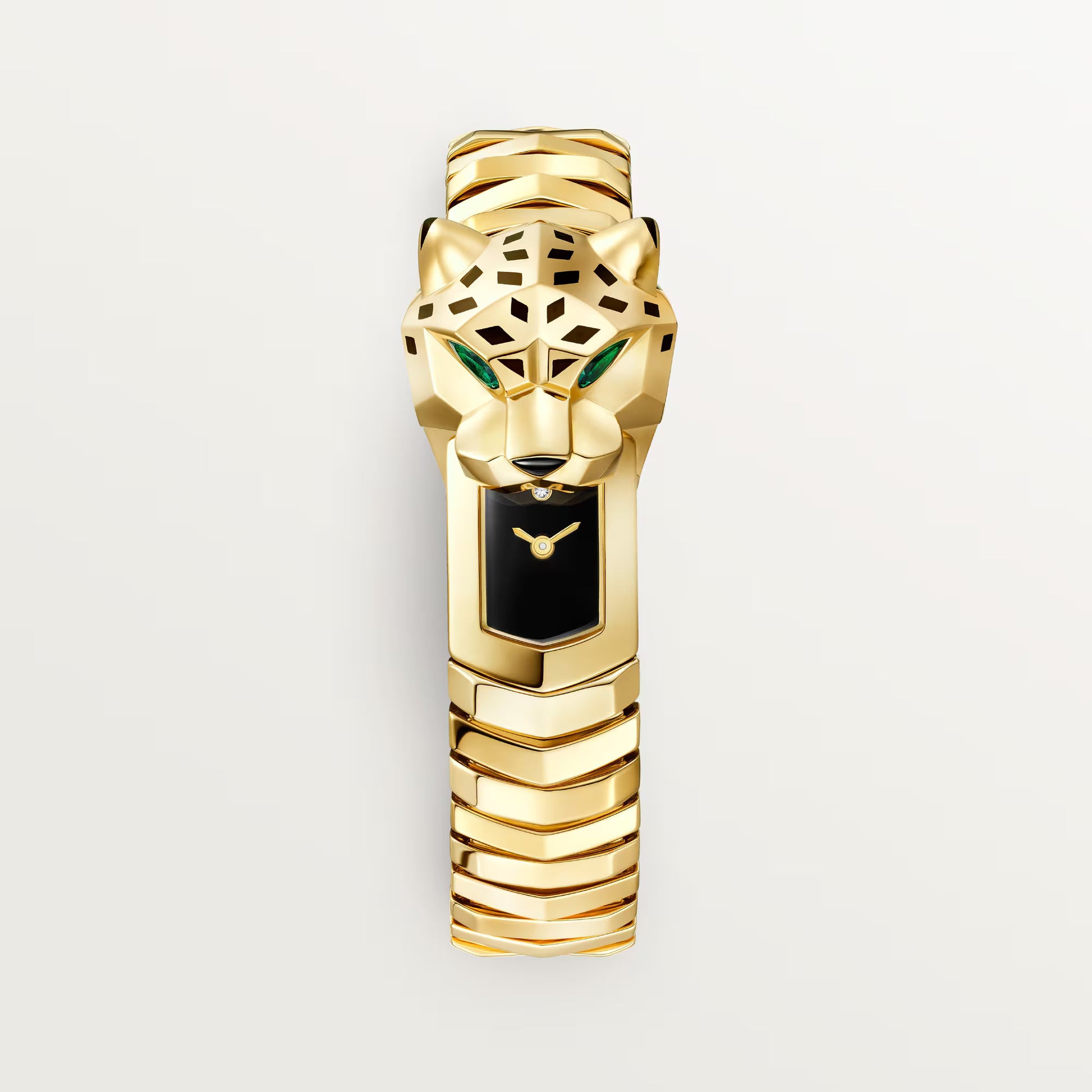 Panthère de Cartier watch, 38.2 mm, quartz movement. 18K yellow gold (750/1000) panther head and case, pear-cut tsavorite eyes, buff-top onyx nose, black lacquer spots, black lacquer dial, steel sword-shaped hands, sapphire crystal, 18K yellow gold (750/1000) bracelet. Thickness: 7.53 mm. Water-resistant up to 3 bar (approx. 30 meters/100 feet).