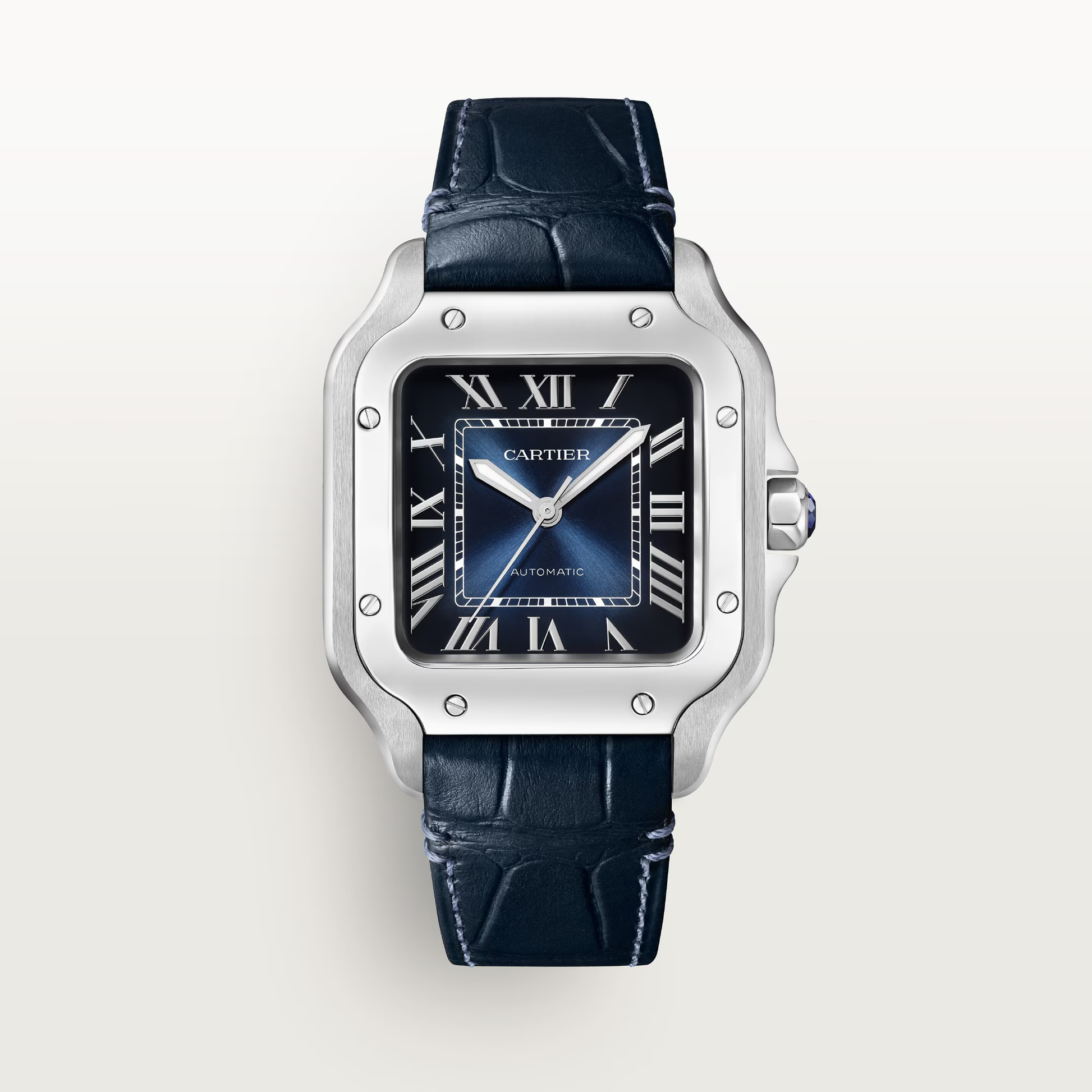 Santos de Cartier watch, medium model, mechanical movement with automatic winding 1847 MC. Steel case, 7-sided crown with synthetic faceted blue spinel, graduated blue dial, polished steel sword-shaped hands with luminescent material, sapphire crystal. Steel bracelet with SmartLink adjustment system. Second strap in blue alligator skin, with interchangeable folding steel buckle. Both are fitted with the QuickSwitch interchangeable system. Case width: 35.1 mm, thickness: 8.83 mm. Water-resistant up to 10 bar (approx. 100 meters/330 feet).
