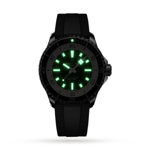 For maximum safety underwater, a ceramic unidirectional bezel frames the black dial, with hands and indexes coated in luminescent Super-LumiNova for superior readability.