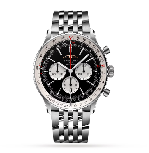Enhancing the original features of Navitimers from seventy years ago, this model features a black dial with baton indexes, a trio of chronograph counters, and a notched bezel for easy grip.