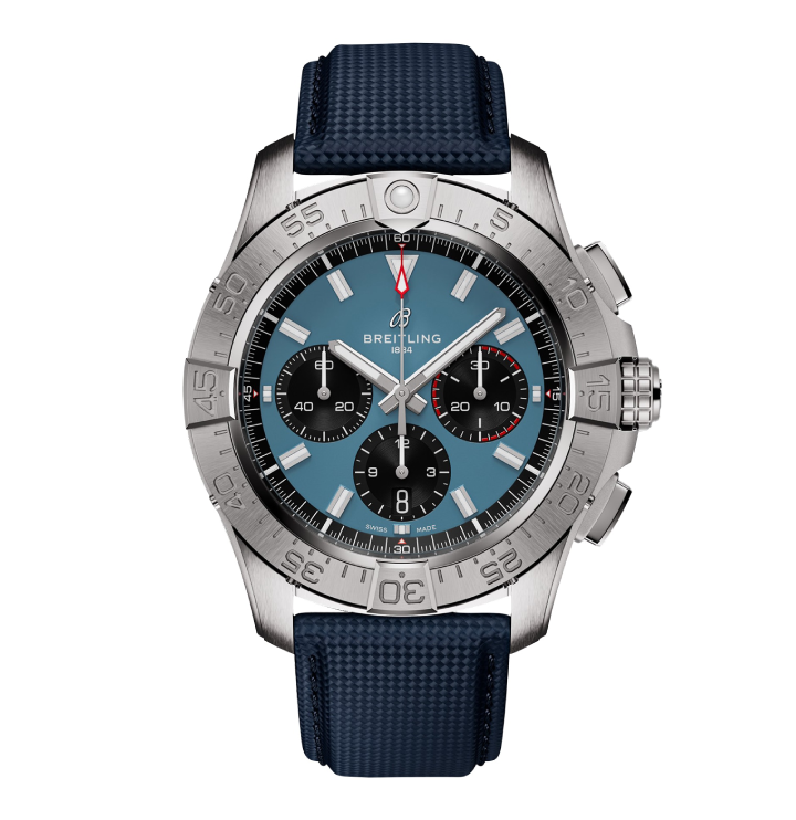Presented on a military-inspired, blue leather strap, this 44mm Avenger model features a stainless steel case with specialised grip patterns for easy operation while wearing gloves.