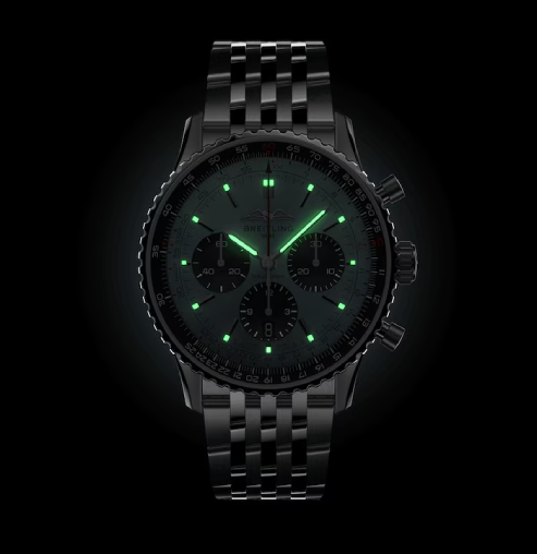 The striking blue dial captures attention through traditional Navitimer details including baton indexes and three chronograph counters, alongside polished hands and a notched bezel for easy grip.
