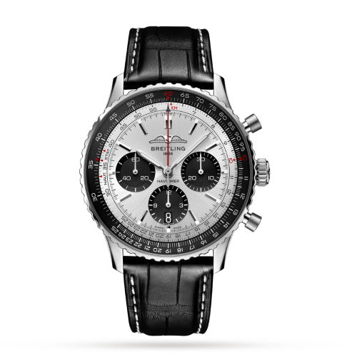 The silver-tone dial presents silver hands, a date display at 6 o’clock, and traditional Navitimer details including three chronograph counters and baton indexes.