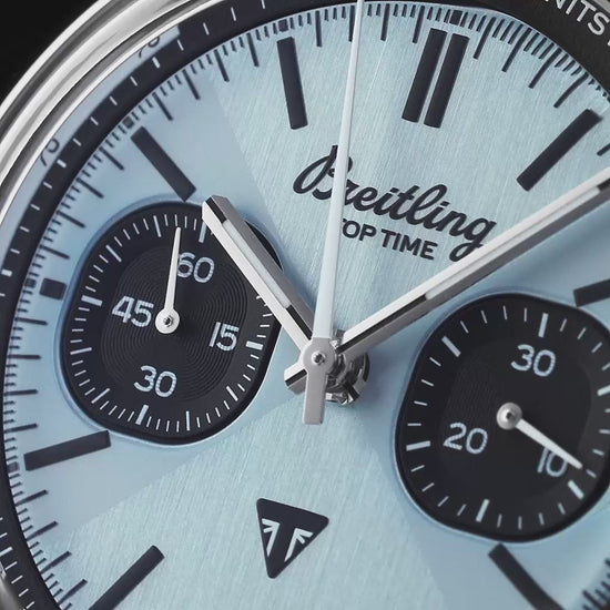 The ice blue dial, colour matched to the Triumph Thunderbird 6T from 1951, features a speed measuring tachymeter scale, a Triumph emblem at 6 o'clock, and contrasting sub dials.
