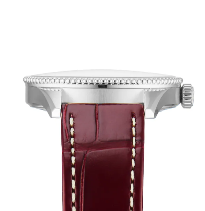 - Beautifully housed in a 32mm stainless steel case with a bold burgundy alligator leather strap
