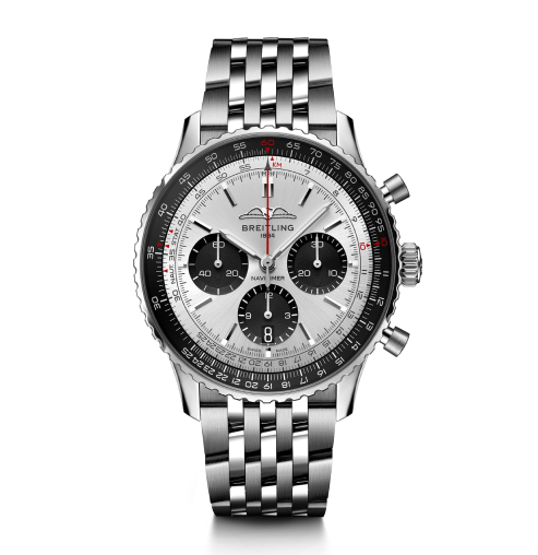 This well-equipped Navitimer model presents a silver-tone dial with polished silver baton indexes, hands, and three chronograph counters.