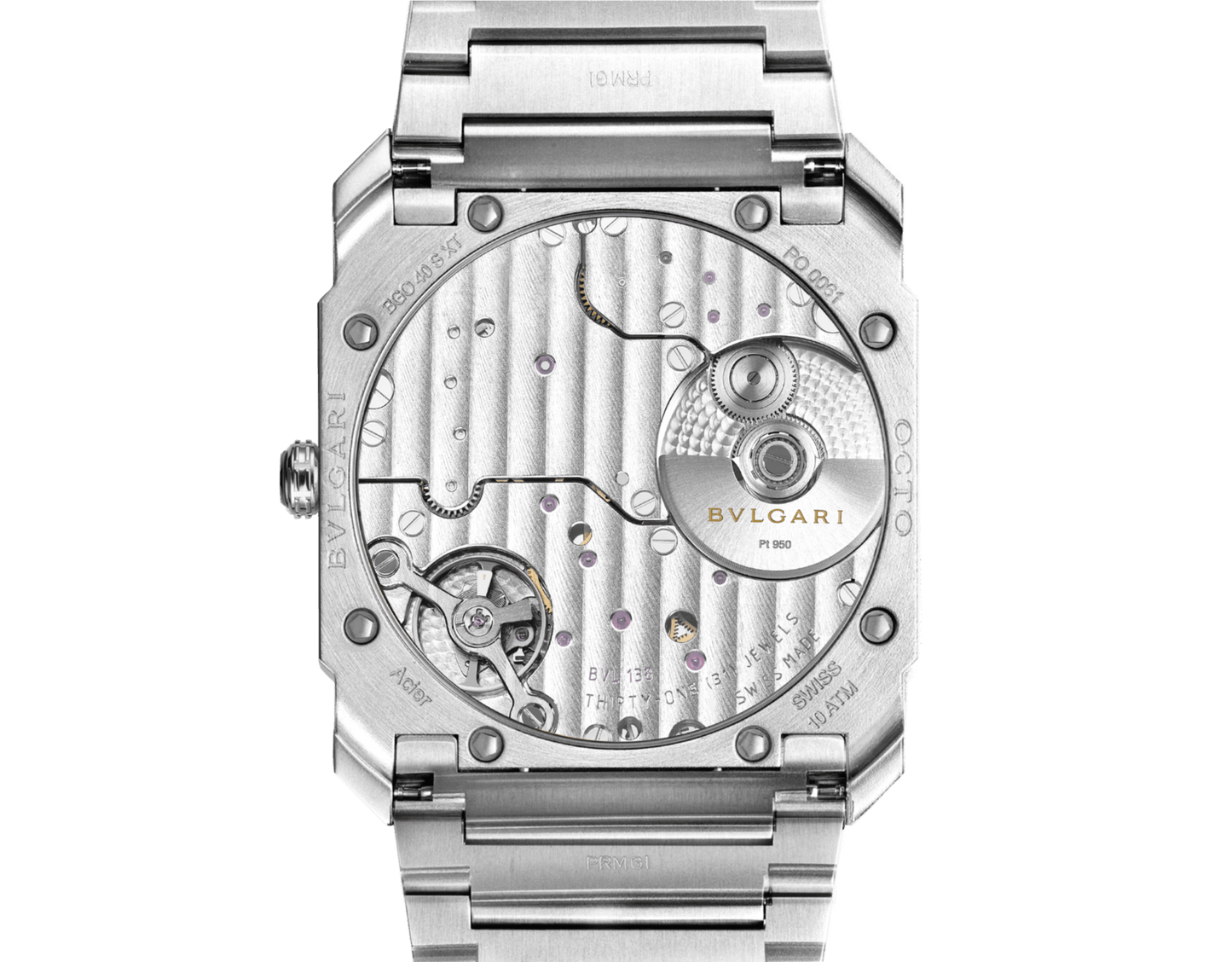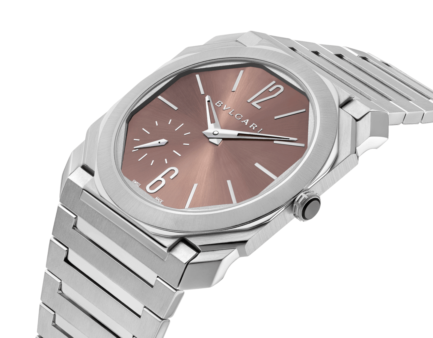 Octo Finissimo Automatic watch with ultra-thin mechanical manufacture movement with automatic winding (platinum micro-rotor), BVL 138 caliber (2.23 mm thick), hours, minutes and small seconds, 60-hour power reserve, frequency 21'600 Vph (3Hz) and 31 jewels. 40 mm extra-thin satin-polished stainless steel case (6.40 mm thick), polished stainless-steel screw-down crown set with a black ceramic insert, sun-brushed metallic salmon dial with rhodium applied stickers, transparent caseback, integrated satin-polished stainless steel bracelet with folding buckle. Water resistant up to 100 meters.