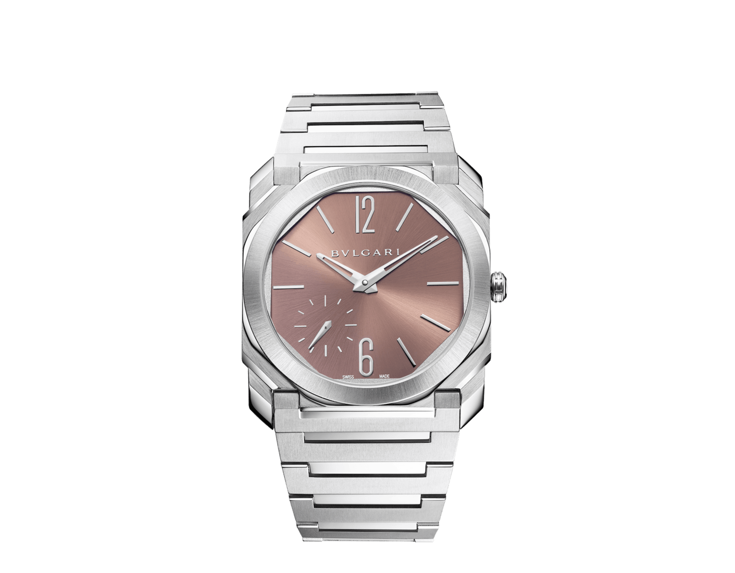 Octo Finissimo Automatic watch in satin-polished stainless steel with mechanical manufacture ultra-thin movement (2.23 mm thick), automatic winding and sun-brushed metallic salmon dial with rhodium applied stickers. Water resistant up to 100 meters.