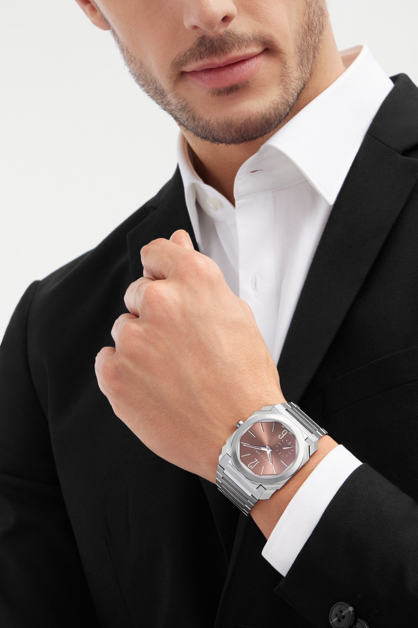 A true icon of contemporary fine watchmaking, the Octo Finissimo Automatic watch channels the rare fusion of Italian design and Swiss engineering through its ultra-appealing look in satin-polished stainless steel and uncompromisingly forward-thinking mechanics. Endowed with a self-winding manufacture movement, retaining its record slimness of 2.23 mm, the timepiece plays on the contrasts between the gleaming metal and the sun-brushed metallic salmon dial with rhodium applied stickers.