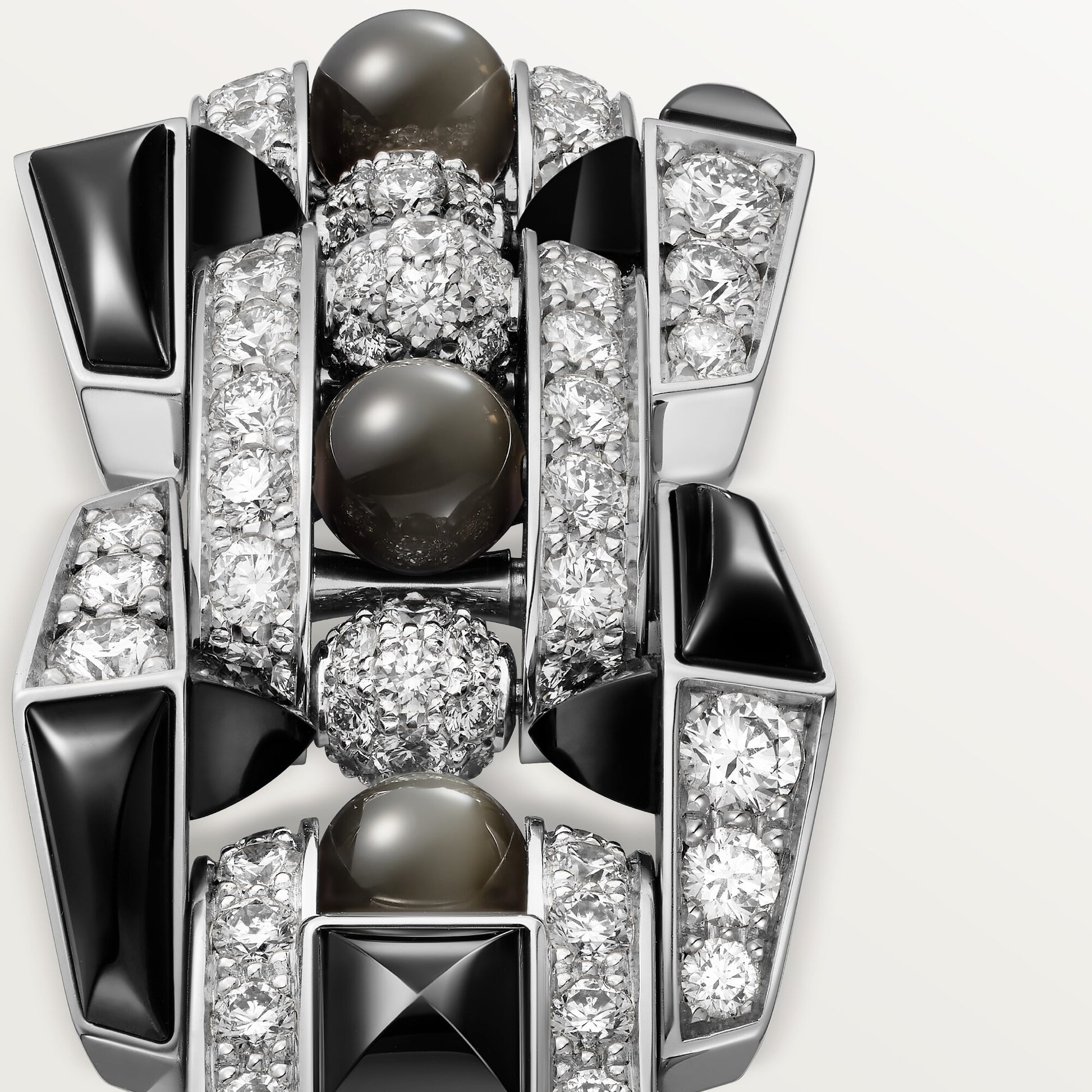 Clash [Un]limited watch, small model, quartz movement. Rhodiumized 18K white gold (750/1000) case set with 28 brilliant-cut diamonds totaling 0.73 carats, spinels, obsidian. Rhodiumized 18K white gold (750/1000) bracelet set with 603 brilliant-cut diamonds totaling 9.23 carats, spinels, obsidian. Rhodiumized 18K white gold (750/1000) dial set with 71 brilliant-cut diamonds totaling 0.39 carats, spinel. Rhodiumized steel sword-shaped hands, sapphire crystal. Case dimensions: 18.4 x 32.7 mm, thickness 8.1 mm. Water-resistant up to 3 bar (approx. 30 meters/100 feet).