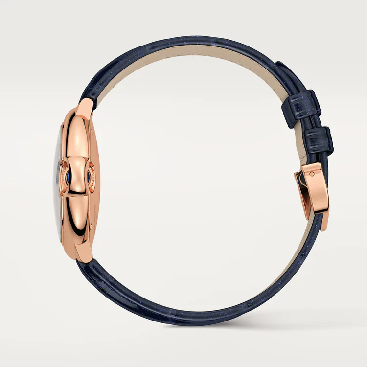 Ballon Bleu de Cartier watch, 33 mm. Self-winding mechanical movement. Rose gold 750/1000 case and fluted crown in rose gold 750/1000 set with a sapphire cabochon. Matt silvered stamped sunray dial set with 21 brilliant-cut diamonds totaling 0.10 carats. Blued-steel sword-shaped hands. Sapphire crystal. Strap in blue alligator leather, rose gold 750/1000 ardillon buckle. Thickness: 0.4”. Water-resistant up to 3 bar (approx. 30 meters/100 feet).