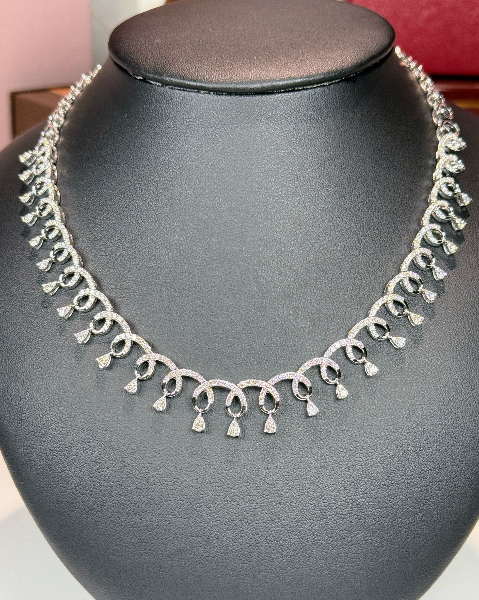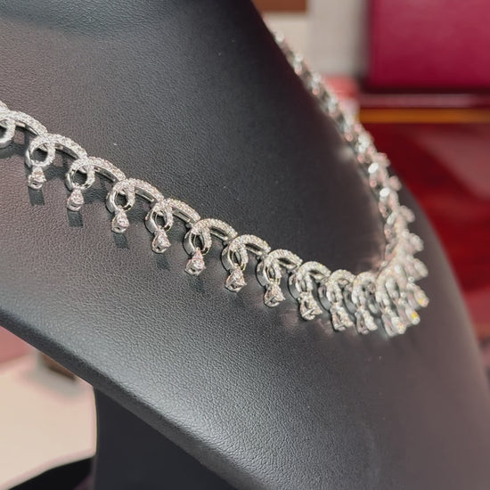 Curvy Pattern and Dangling Raindrops 14k White Gold Diamond Necklace