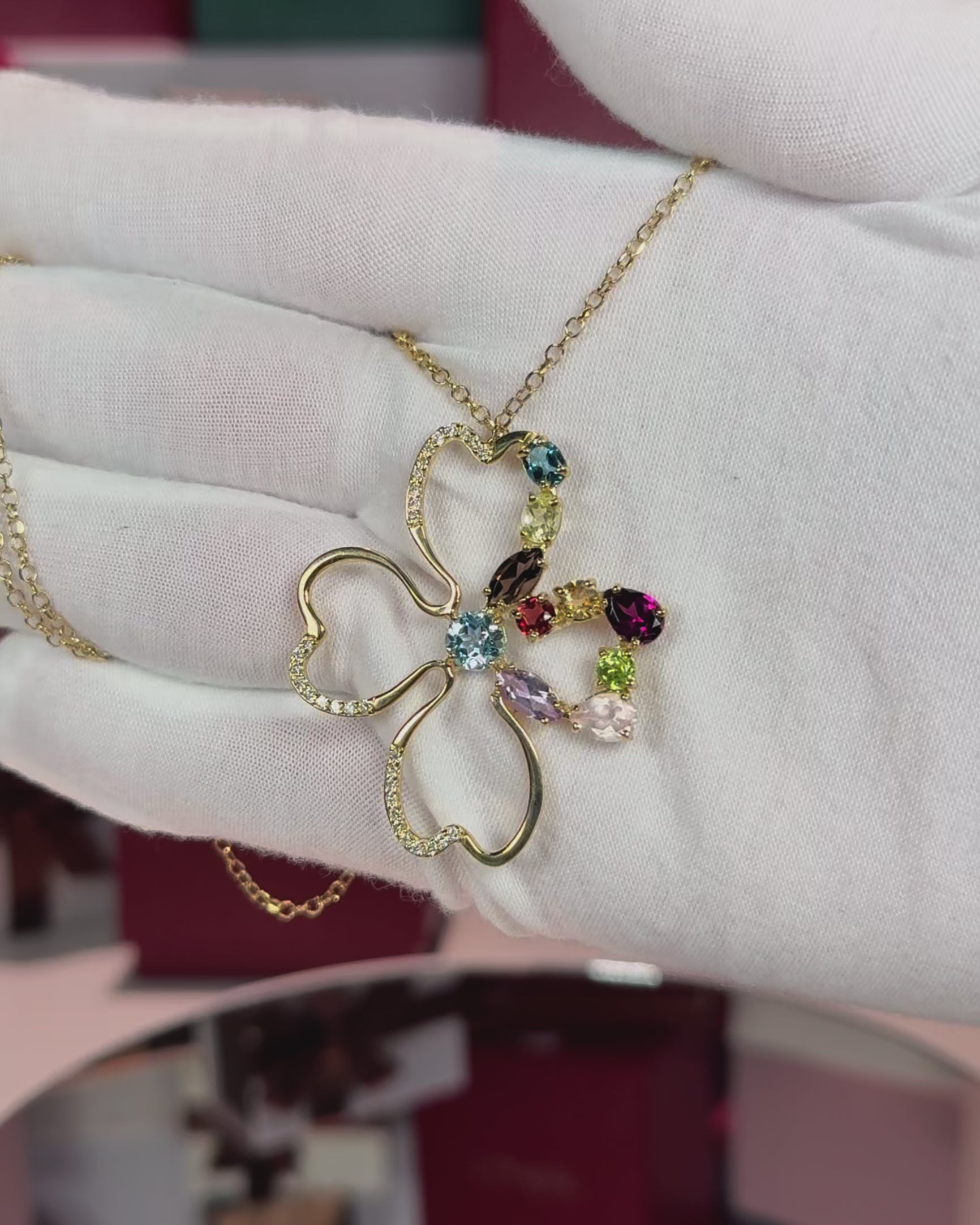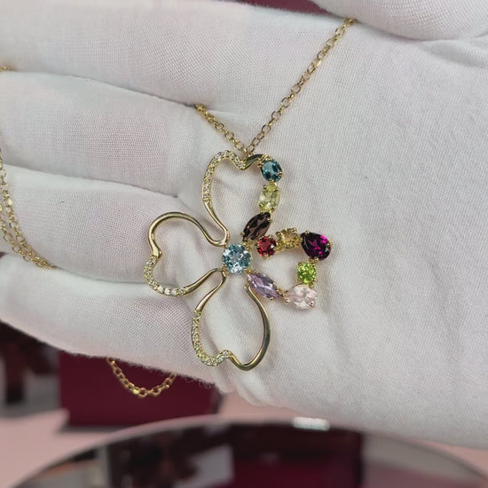 Assorted Colorstones Four Leaf Clover Design 14k Yellow Gold Pendant Necklace