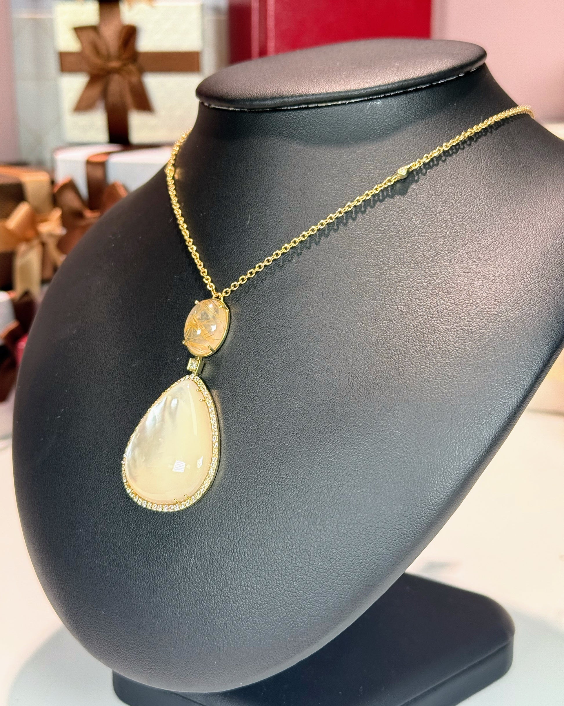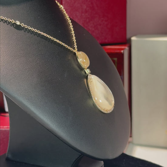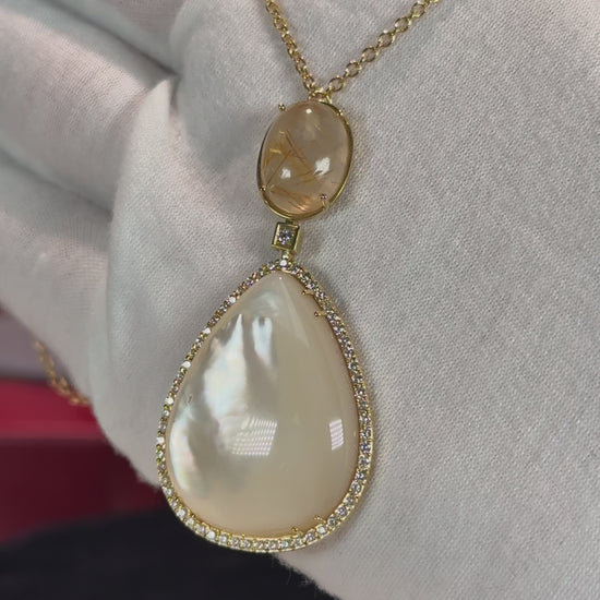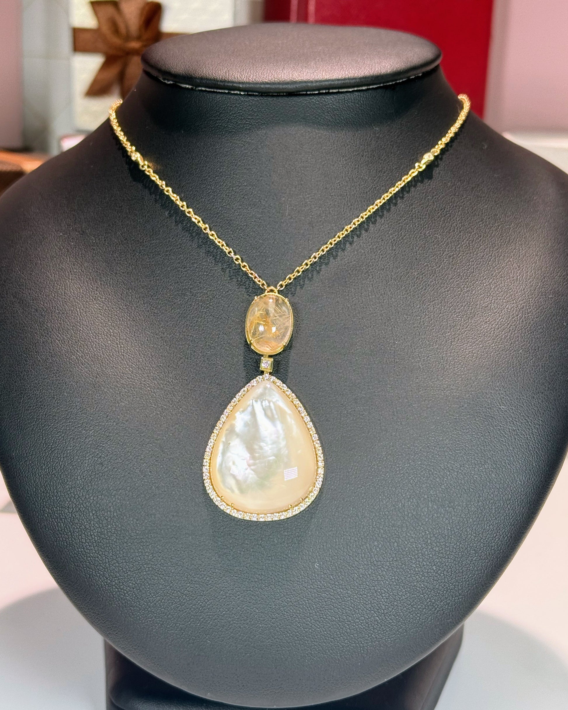 Gold Rutile Quartz and Mother of Pearl 14k Yellow Gold Pendant Necklace