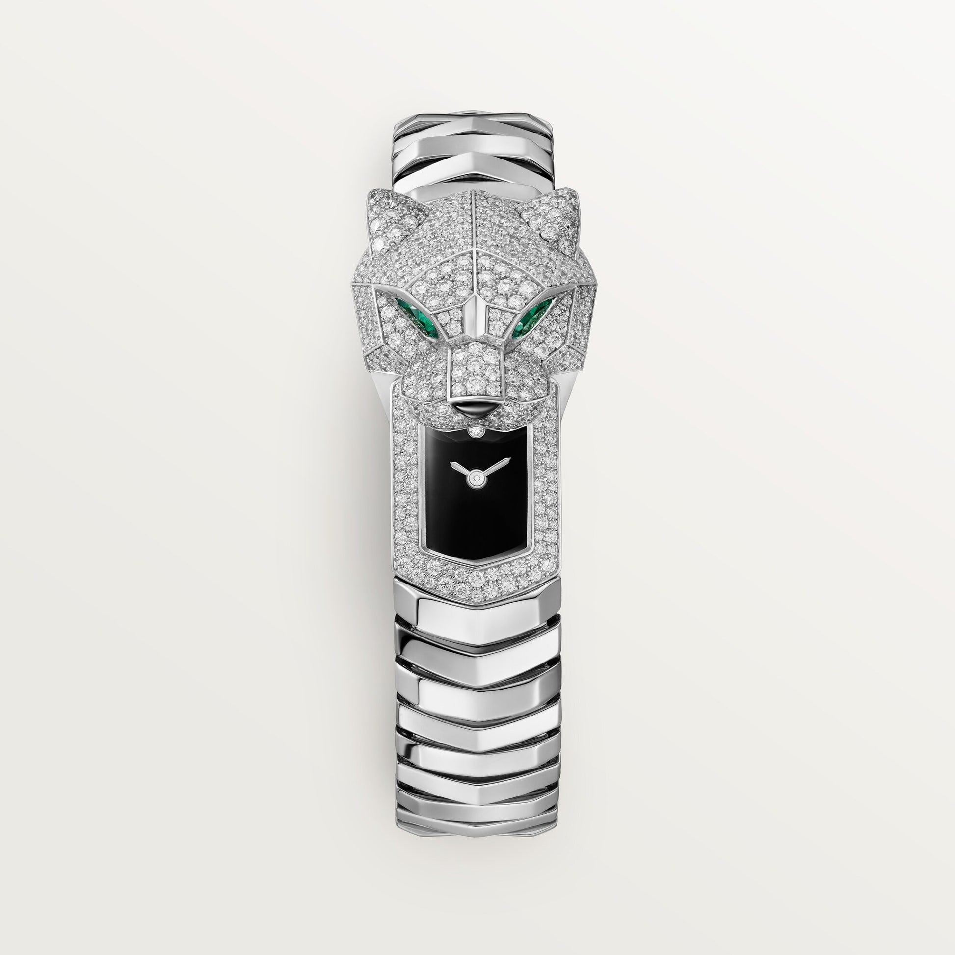 Panthère de Cartier watch, 38.2 mm, quartz movement. Rhodium-finish white gold 750/1000 panther head and case set with 614 brilliant-cut diamonds totaling 4.41 carats, pear-cut emerald eyes, buff-top onyx nose, black lacquer dial, rhodium-finish steel sword-shaped hands, sapphire crystal, rhodium-finish white gold 750/1000 bracelet.