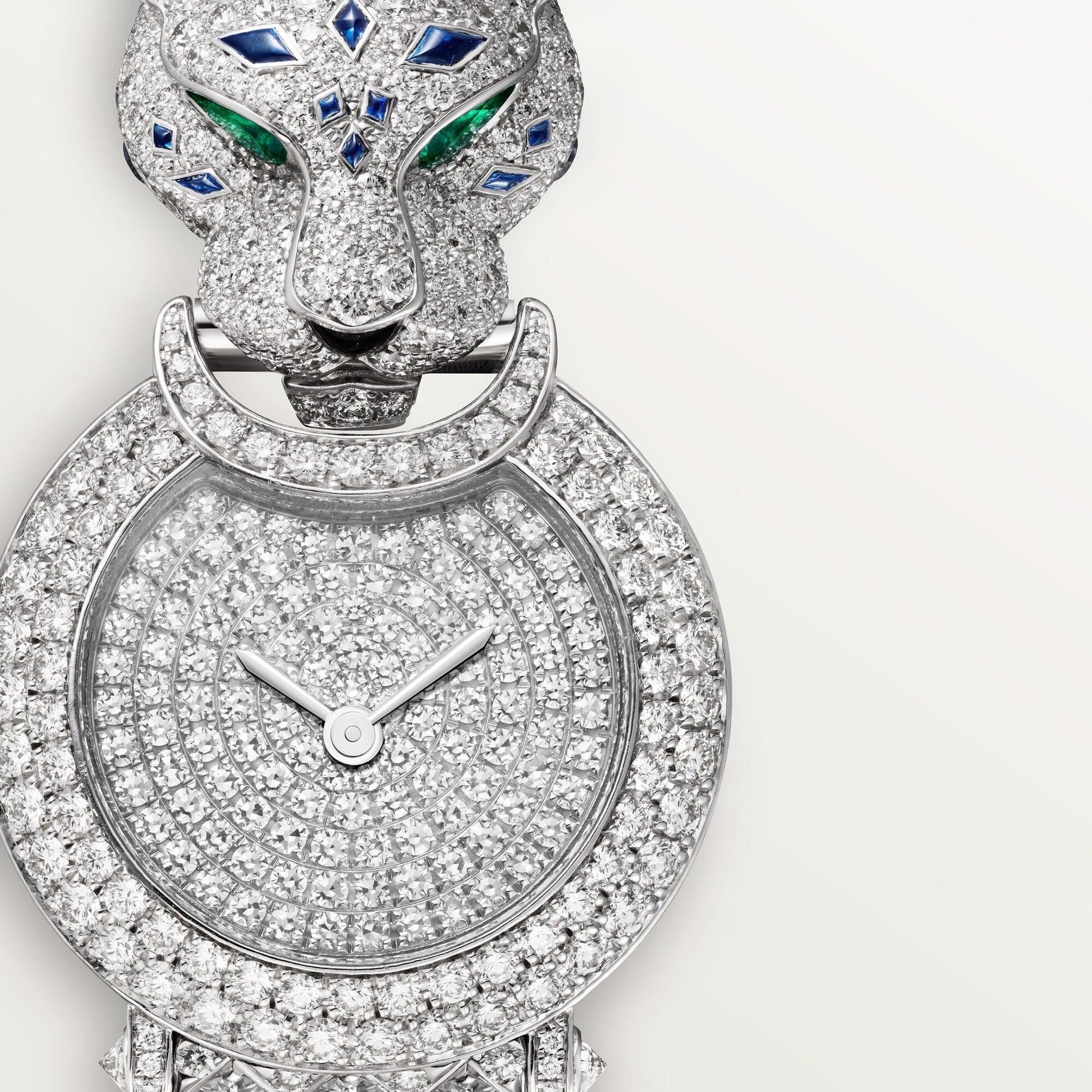 La Panthère watch, 23.6 mm, quartz movement. Rhodiumized 18K white gold (750/1000) case set with 136 brilliant-cut diamonds totaling 1.04 carat, panther head in rhodiumized 18K white gold (750/1000) set with 297 brilliant-cut diamonds totaling 1.43 carats, pear-shaped emerald eyes totaling 0.15 carat, buff-top onyx nose, rhodiumized 18K white gold (750/1000) dial set with 117 diamonds totaling 0.54 carats, rhodiumized steel sword-shaped hands, rhodiumized 18K white gold (750/1000) bracelet set with 270 brilliant-cut diamonds totaling 9.13 carats. Thickness: 7.8 mm. Water-resistant up to 3 bar (approx. 30 meters/100 feet).