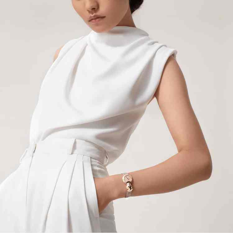 La Panthère watch, 23.6 mm, quartz movement. Rose gold 750/1000 case set with 40 brilliant-cut diamonds totaling 0.24 carat, rose gold 750/1000 panther head, pear-shaped tsavorite eyes totaling 0.16 carat, black lacquer spots and nose, pink dial, blued-steel sword-shaped hands, light gray semi-matte alligator leather strap, rose gold 750/1000 ardillon buckle. Thickness: 7.7 mm. Water-resistant up to 3 bar (approx. 30 meters/100 feet).