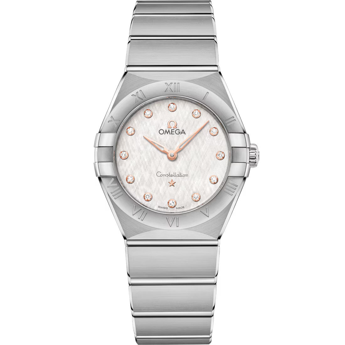 This 28 mm stainless steel model features a bezel engraved with Roman numerals, cream silvery dial with silk-like pattern and scratch-resistant sapphire crystal. The hands, OMEGA logo, Constellation star and diamond holders are in 18K Sedna™ gold.