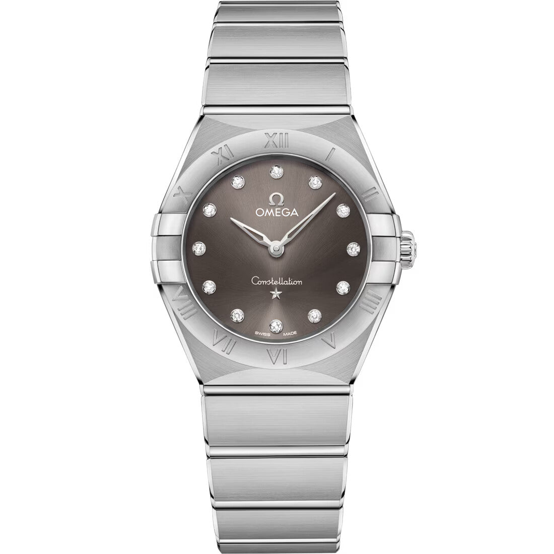 This 28 mm stainless steel model features a bezel engraved with Roman numerals, sun-brushed grey dial with diamond hour markers and scratch-resistant saphire crystal. The hands, OMEGA logo, Constellation star and diamond holders are in 18K white gold.