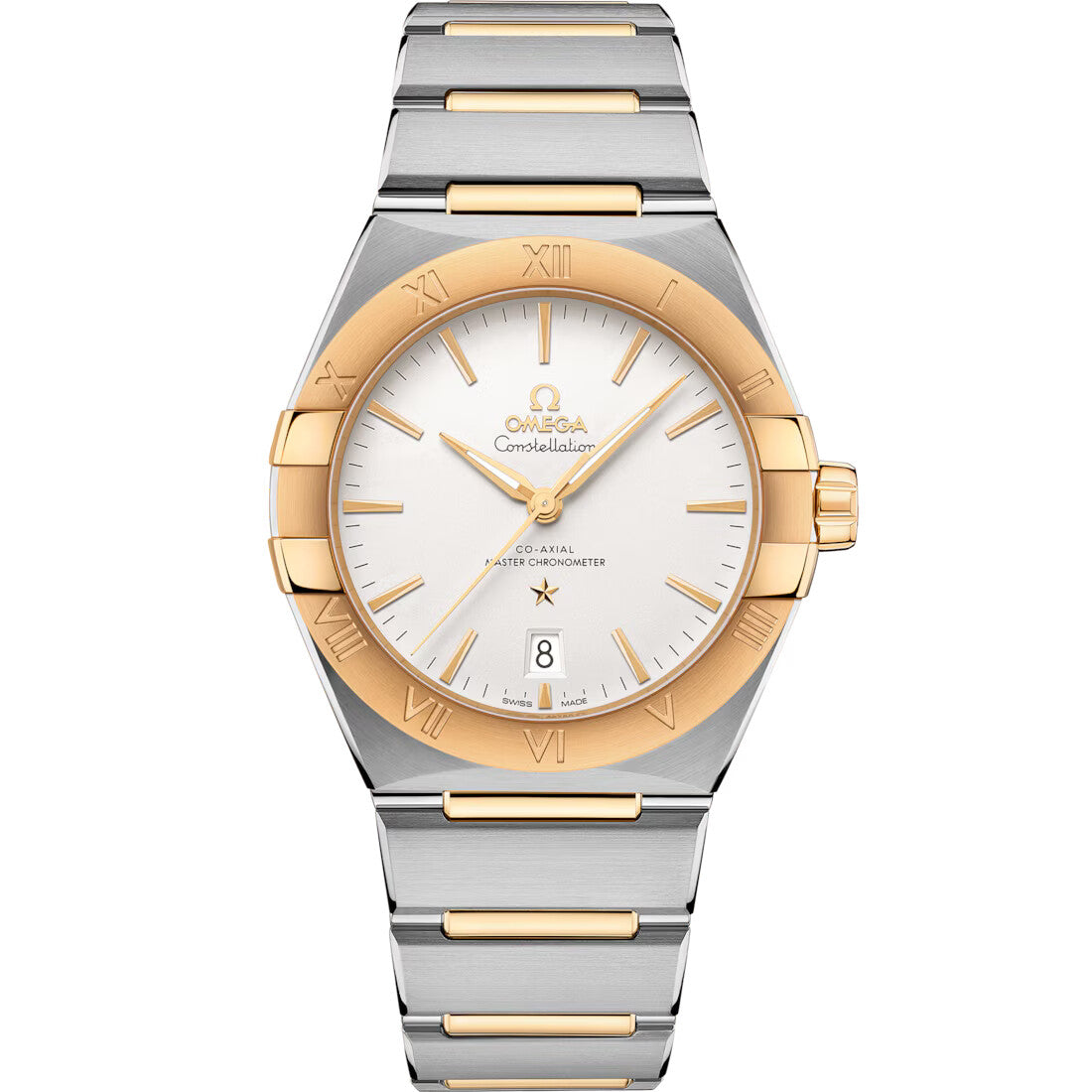 This 39 mm stainless steel and 18K yellow gold model features a bezel engraved with Roman numerals, an opaline white silvery dial and a date window at the 6 o'clock position. The hands, OMEGA logo, Constellation star and indexes are all in 18K yellow gold.