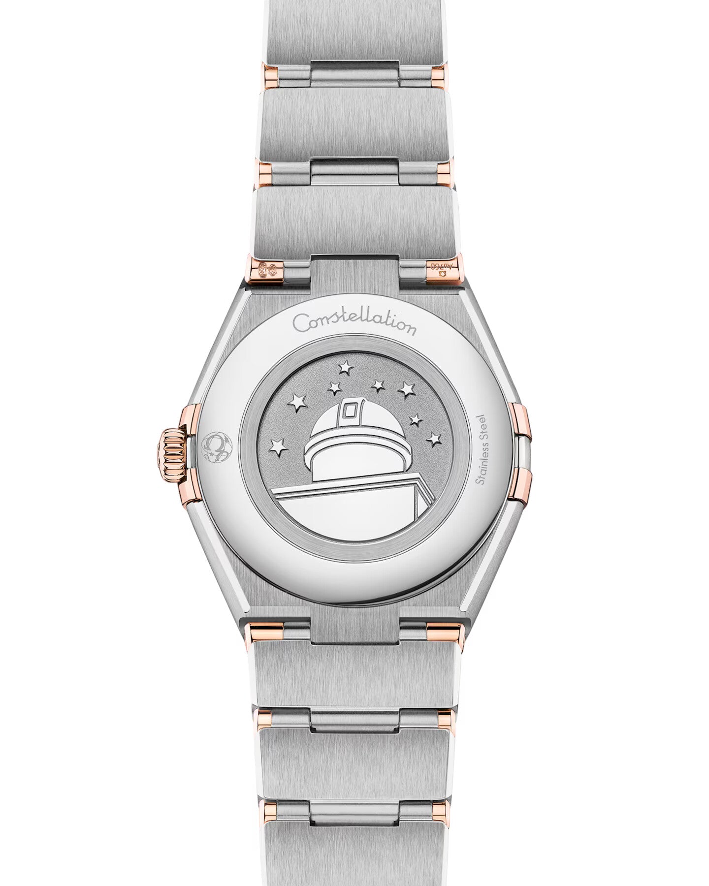 The 28 mm watch is presented with a case and mono-rang bracelet created from stainless steel and 18K Sedna™ Gold, with signature Constellation features including the polished claws, half-moon facets, and a diamond-paved bezel.