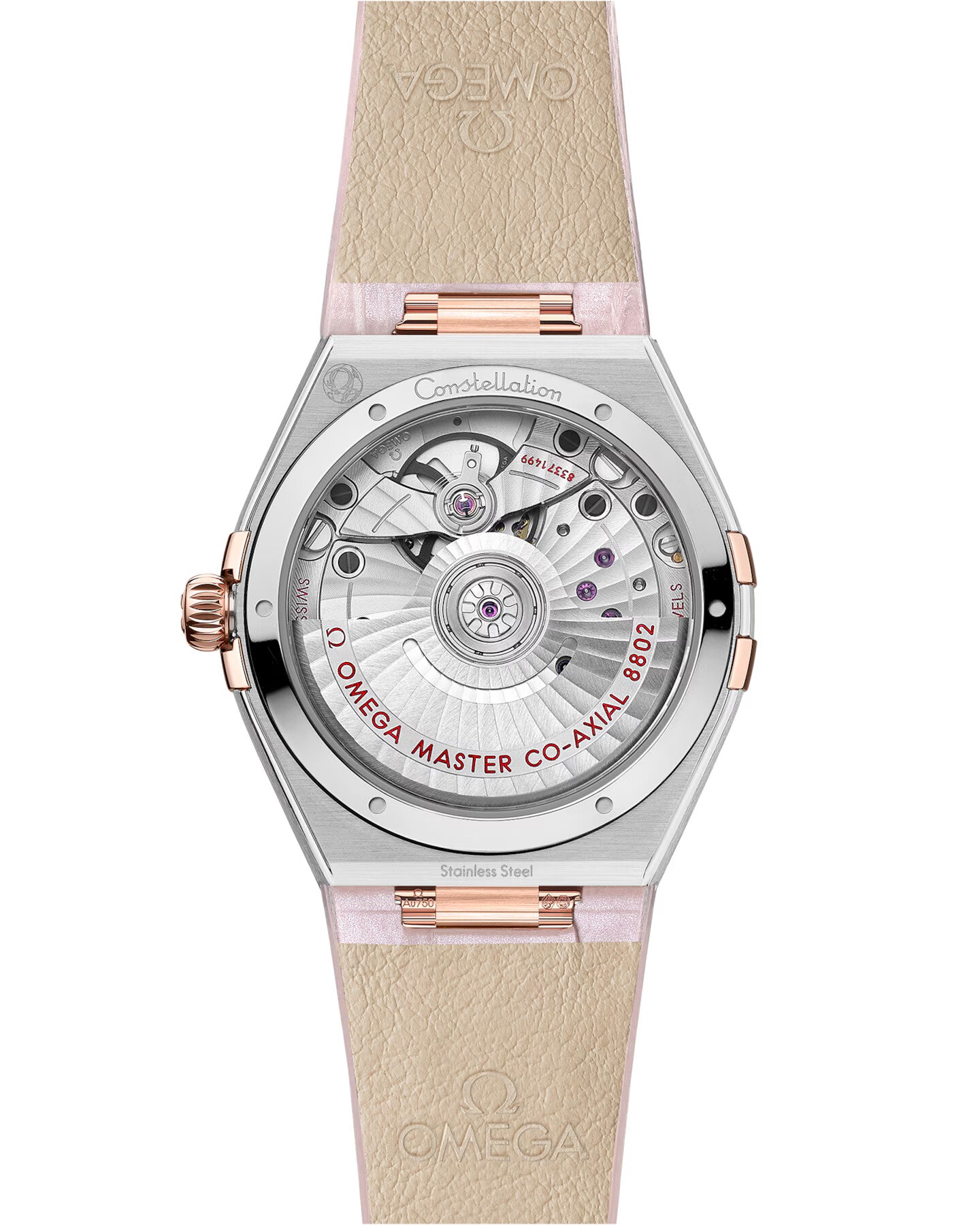 Presented on a light pink leather strap, the timepiece is driven by the OMEGA Co-Axial Master Chronometer Calibre 8802, visible through the domed scratch-resistant sapphire crystal.