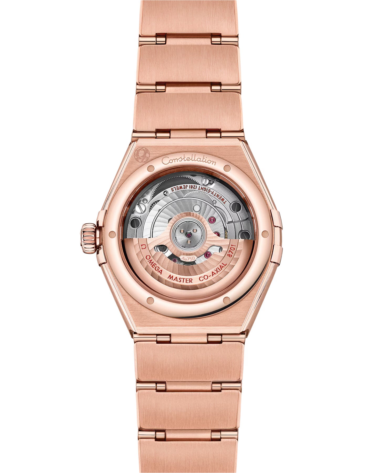 At the heart of this timepiece is the OMEGA Co-Axial Master Chronometer Calibre 8701, visible through the domed scratch-resistant sapphire crystal.