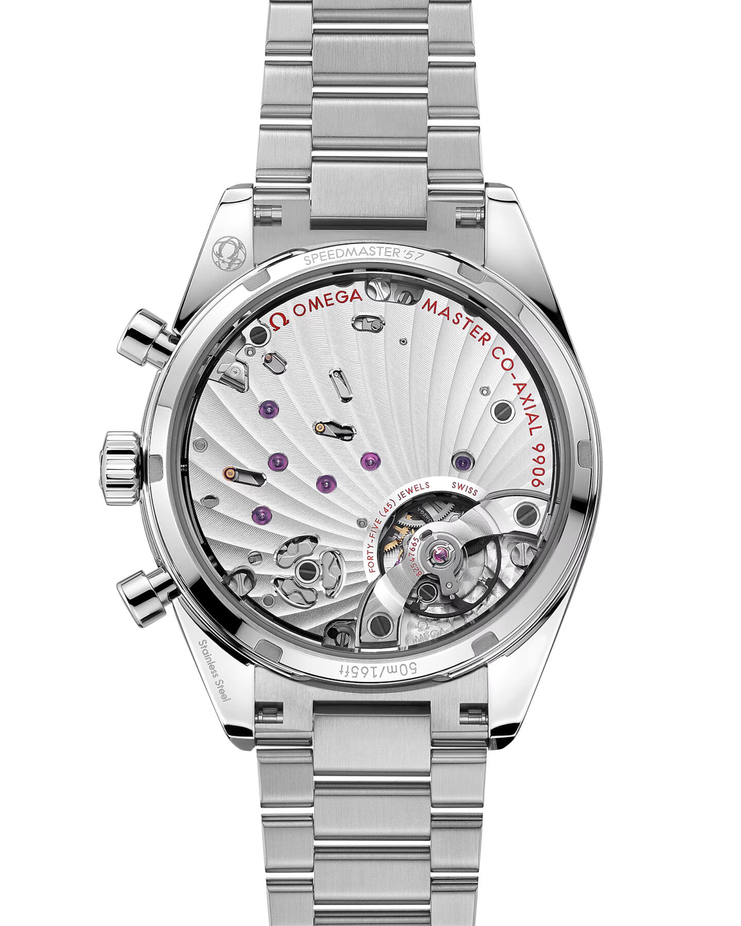 The brushed bezel includes a blackened tachymeter scale, while on the caseback, there is a “Speedmaster ‘57” engraving as well as a flat sapphire crystal with an anti-reflective treatment inside.