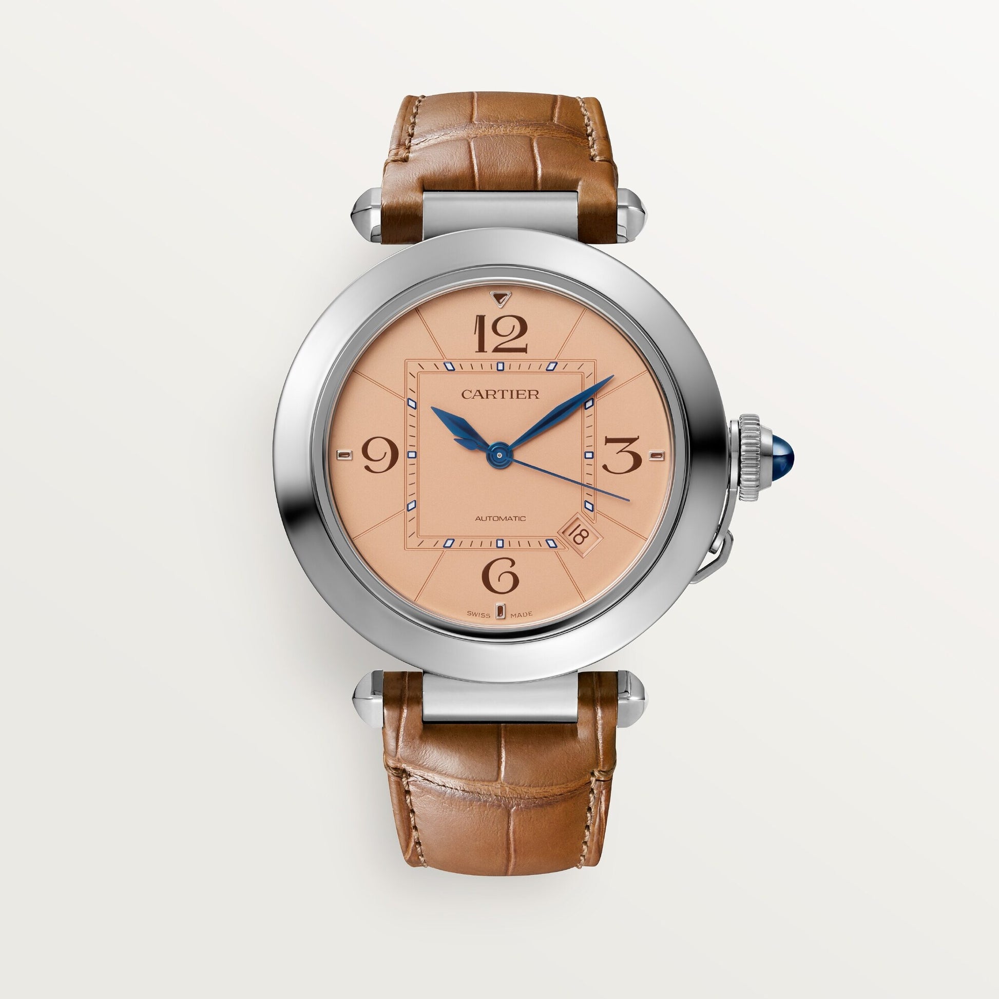 Pasha de Cartier watch, 41 mm, mechanical movement with automatic winding, caliber 1847 MC. Steel case, fluted crown cap and crown with synthetic spinels, grained salmon-colored dial, blued-steel diamond-shaped hands, steel bracelet with SmartLink adjustment system, second strap in brown alligator skin, interchangeable steel folding buckle. Both straps are fitted with the QuickSwitch interchangeable system. Case diameter: 41 mm, thickness: 9.55 mm. Water-resistant up to 10 bar (approx. 100 meters/330 feet).