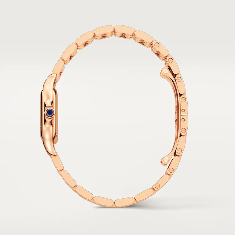 Panthère de Cartier watch, small model, quartz movement. Case in rose gold 750/1000, dimensions: 23 mm x 30 mm, thickness: 6 mm, crown set with a blue sapphire, silvered dial, blued-steel sword-shaped hands, rose gold 750/1000 bracelet. Water-resistant to 3 bar (approx. 30 meters).