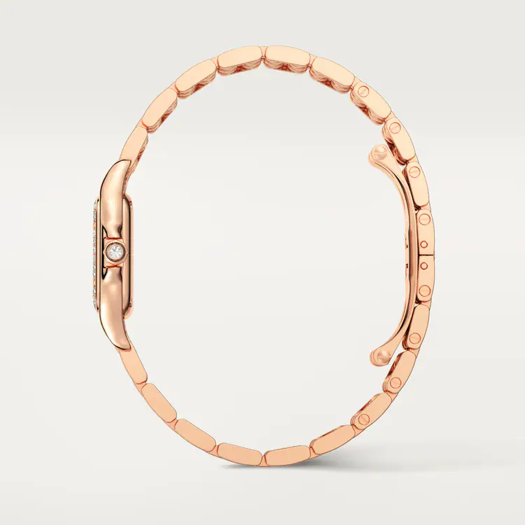 Panthère de Cartier watch, small model, quartz movement. Rose gold 750/1000 case and crown set with 37 brilliant-cut diamonds totaling 0.27 carat. Dimensions: 22 mm x 30 mm, thickness: 6 mm, dial with graded shades of golden plum and brown forming a diagonal in the center, sword-shaped hands, rose gold 750/1000 strap. Water-resistant up to 3 bar (approx. 30 meters/100 feet).