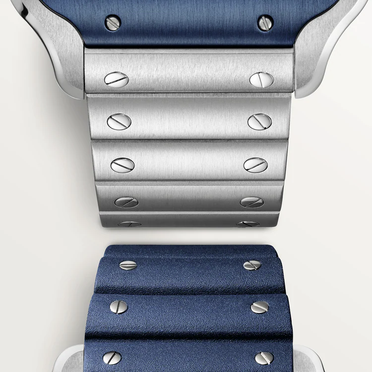 Santos watch, skeleton, large model, Manufacture mechanical movement with manual winding, caliber 9611 MC. Steel case, 7-sided crown set with a sapphire, gray steel sword-shaped hands, sapphire crystal and case back. Steel bracelet with SmartLink adjustment system. Second strap in dark blue rubber, with interchangeable steel deployant buckle. Both straps are fitted with the “QuickSwitch” interchangeability system. Hours and minutes with skeletonized bridges forming Roman numerals, covered in blue lacquer. Movement consisting of 138 parts including 20 rubies. Movement dimensions: 28 mm x 28 mm, movement thickness: 3.97 mm, balance: 28,800 vibrations/hour, power reserve approx. 70 hours. Case width: 39.8 mm, thickness: 9.08 mm. Water-resistant up to 10 bar (approx. 100 meters/330 feet).