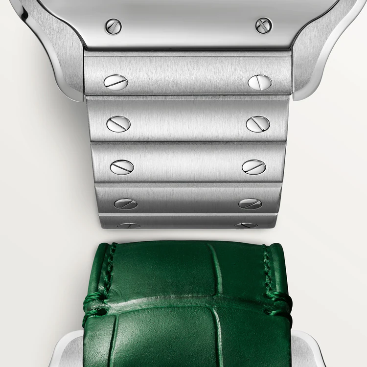 Santos watch, skeleton, large model, Manufacture mechanical movement with manual winding, caliber 9611 MC. Steel case, 7-sided crown set with a green jasper, gray steel sword-shaped hands, sapphire crystal and case back. Steel bracelet with SmartLink adjustment system. Second strap in green alligator leather, with interchangeable steel deployant buckle. Both straps are fitted with the “QuickSwitch” interchangeability system. Hours and minutes with skeletonized bridges forming Roman numerals, covered in green lacquer. Movement consisting of 138 parts including 20 rubies. Movement dimensions: 28 mm x 28 mm, movement thickness: 3.97 mm, balance: 28,800 vibrations/hour, power reserve approx. 70 hours. Case width: 39.8 mm, thickness: 9.08 mm. Water-resistant up to 10 bar (approx. 100 meters/330 feet).