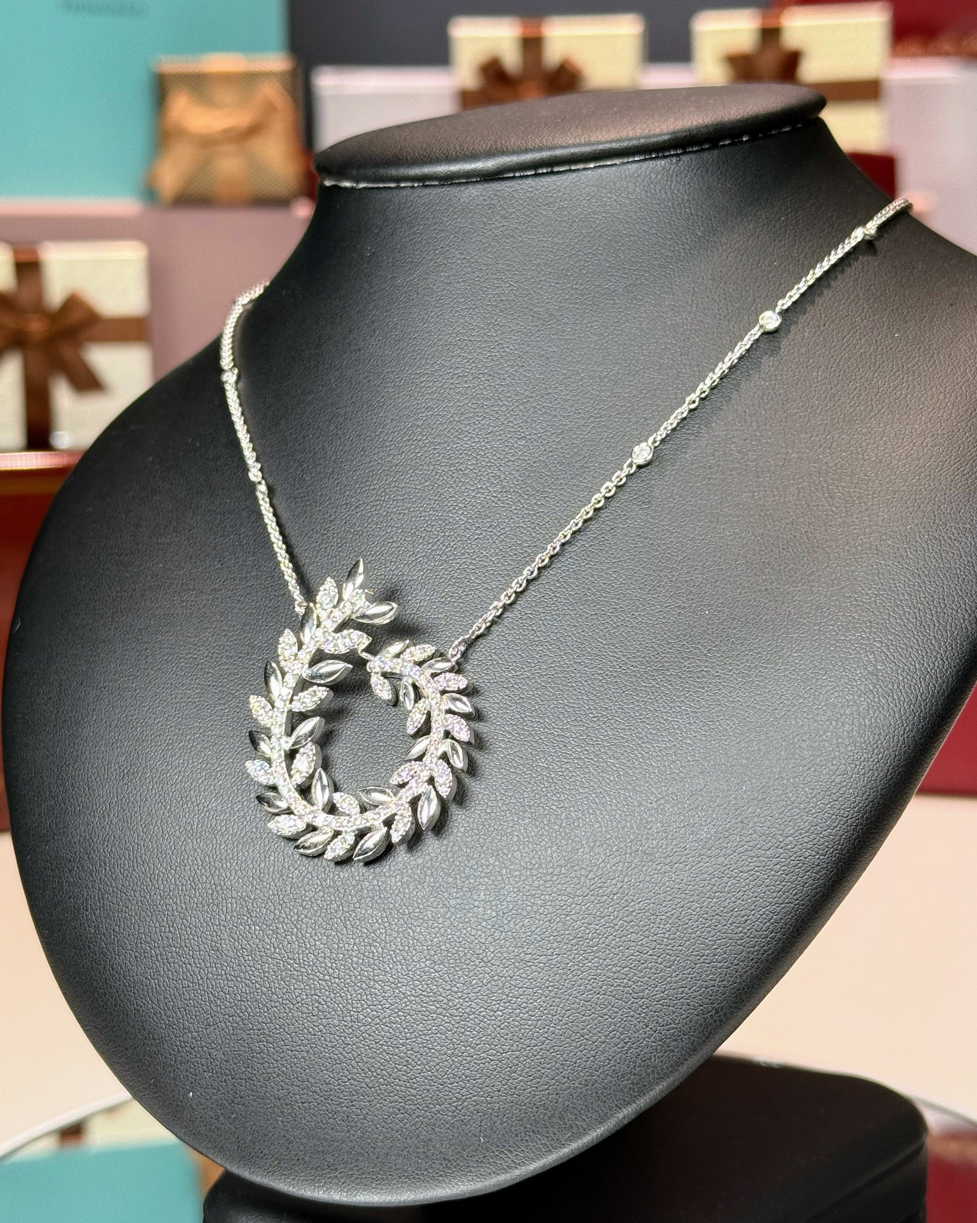 14k White Gold Laurel Wreath Design Diamond Pendant Necklace