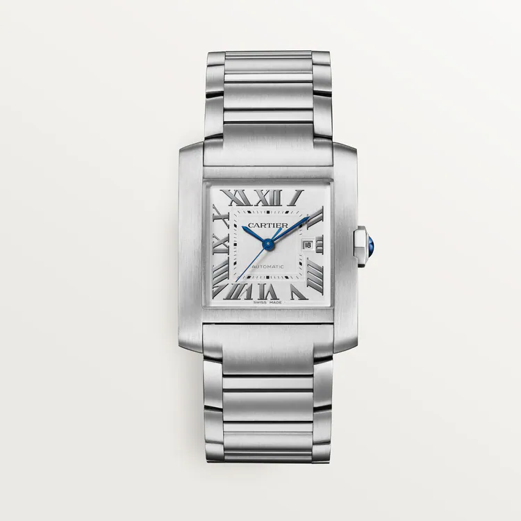 Tank Française watch, large model, mechanical movement with automatic winding. Steel case. Faceted crown in steel decorated with a synthetic cabochon-shaped spinel. Silvered dial, blued-steel sword-shaped hands, sapphire crystal. Steel bracelet. Case dimensions: 36.7 mm x 30.5 mm, thickness: 10.1 mm. Water-resistant up to 3 bar (approx. 30 meters/100 feet).