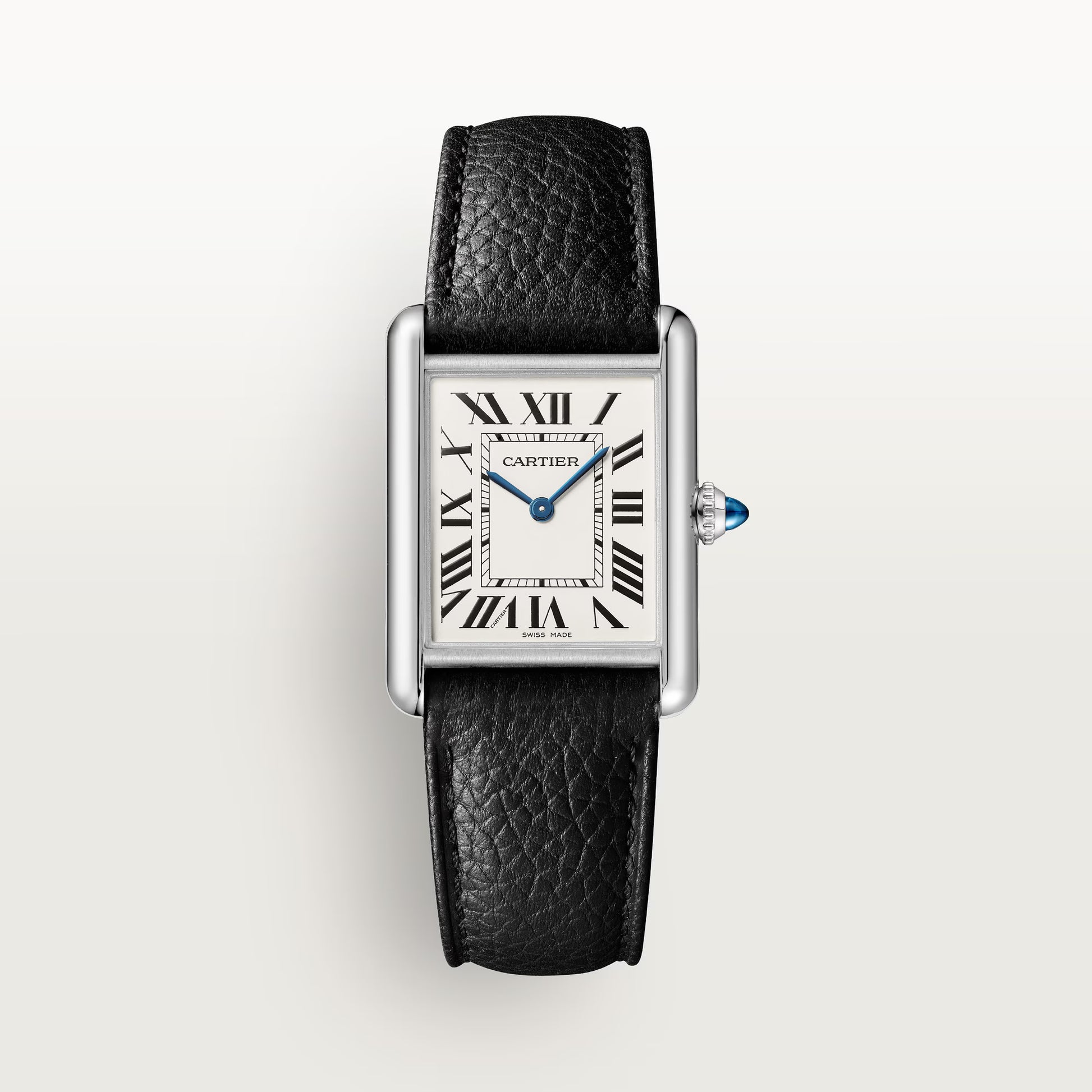 Tank Must watch, large model, high autonomy quartz movement. Steel case, beaded crown set with a synthetic cabochon-shaped spinel, silvered dial, blued-steel sword-shaped hands, interchangeable black grained calfskin strap, steel ardillon buckle. Case dimensions: 33.7 mm x 25.5 mm, thickness: 6.6 mm. Water-resistant up to 3 bar (approx. 30 meters/100 feet).