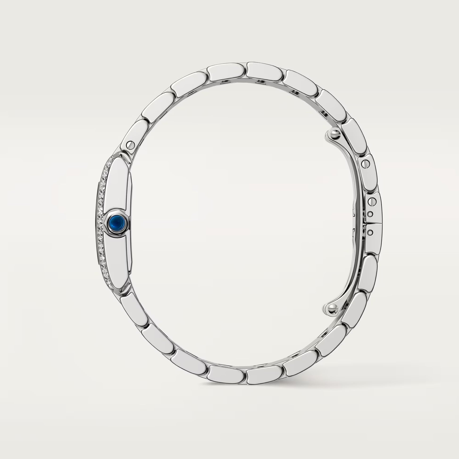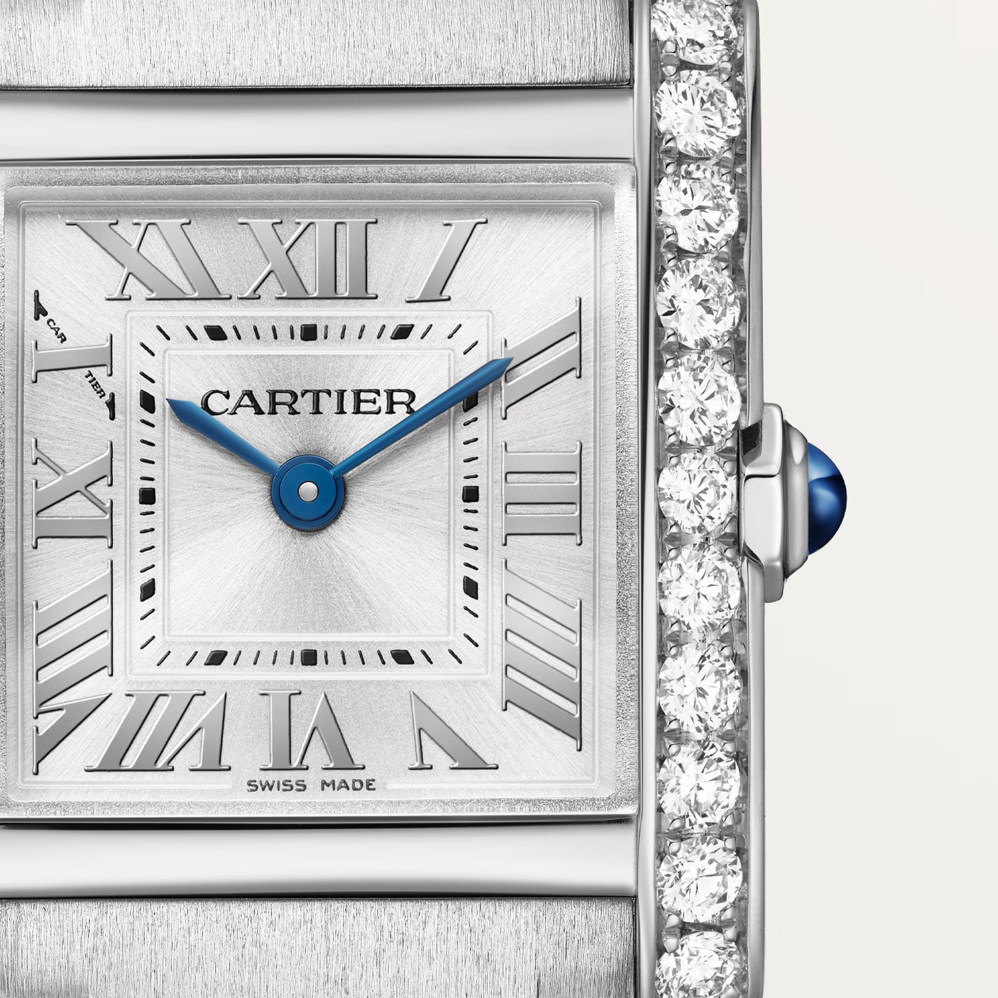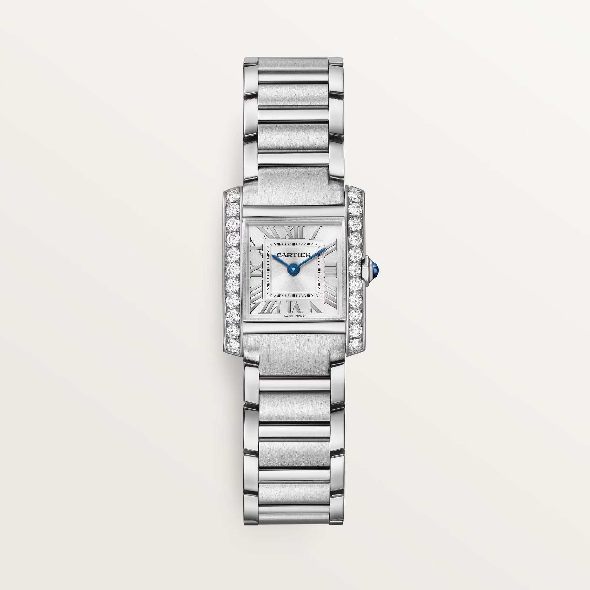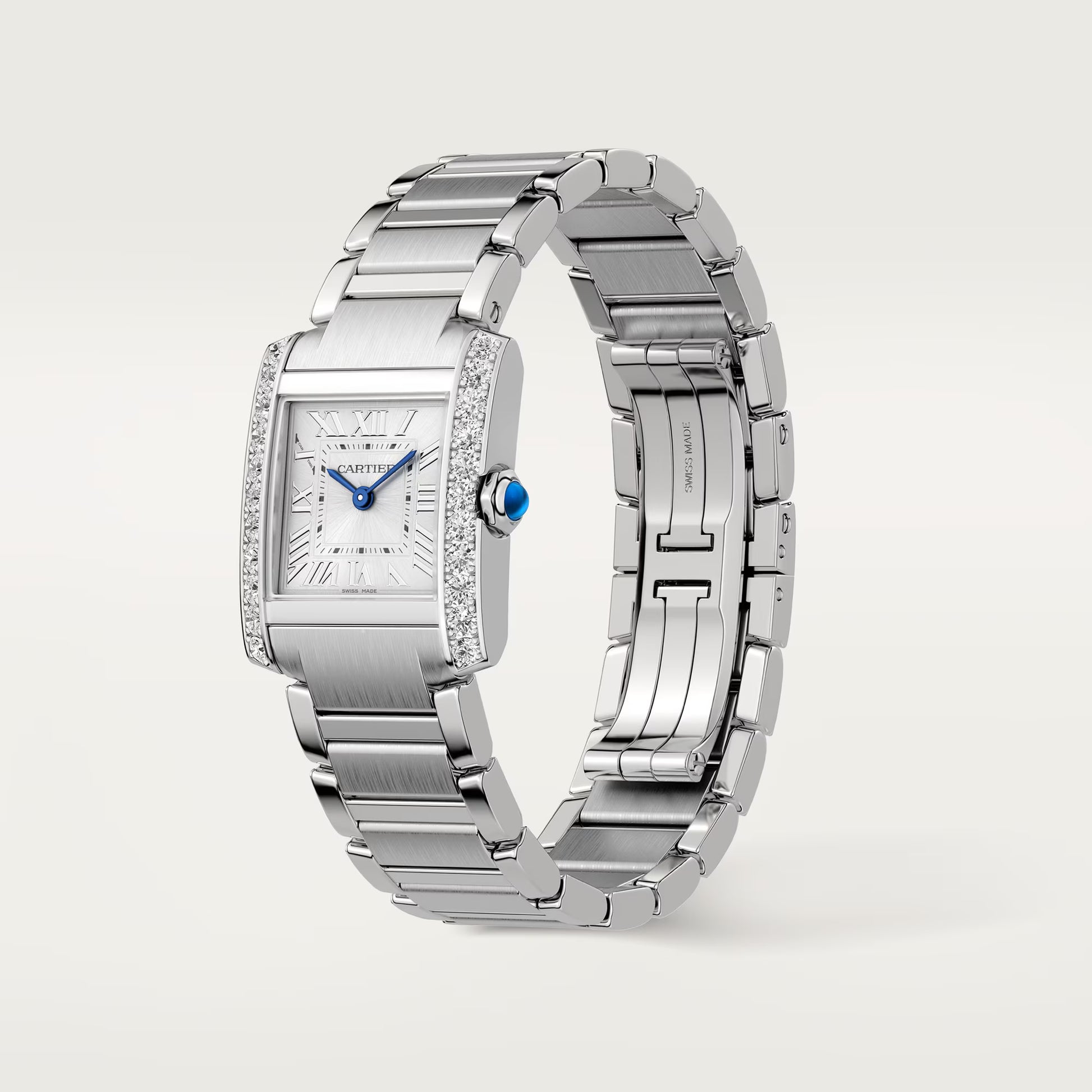 Tank Française watch, small model, quartz movement. Steel case set with 22 diamonds totaling 0.70 carats, steel faceted crown with a synthetic blue cabochon-shaped spinel. Silvered sunray dial, blued-steel sword-shaped hands, sapphire crystal. Steel bracelet. Case dimensions: 25.7 mm x 21.2 mm, thickness: 6.8 mm. Water-resistant up to 3 bar (approx. 30 meters/100 feet).