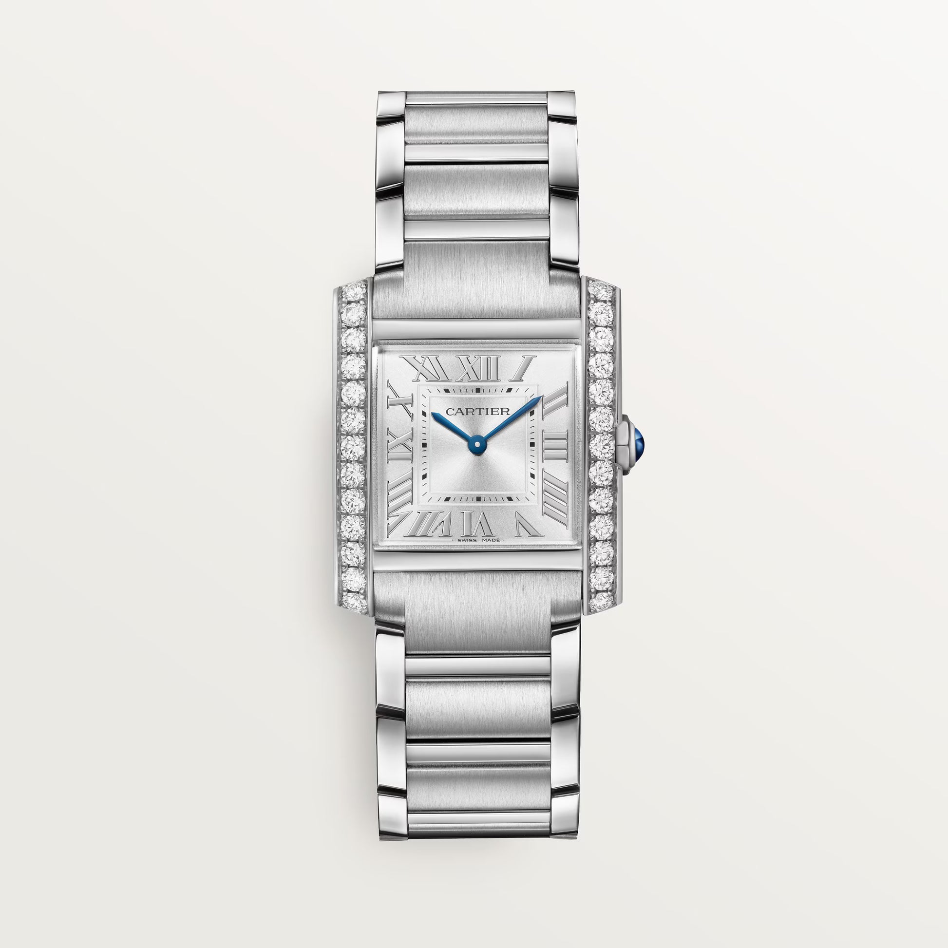 Tank Française watch, medium model, quartz movement. Steel case set with 26 brilliant-cut diamonds totaling 1.09 carats, steel faceted crown with a synthetic blue cabochon-shaped spinel. Silvered sunray dial, blued-steel sword-shaped hands, sapphire crystal. Steel bracelet. Case dimensions: 32 mm x 27 mm, thickness: 7.1 mm. Water-resistant up to 3 bar (approx. 30 meters/100 feet).