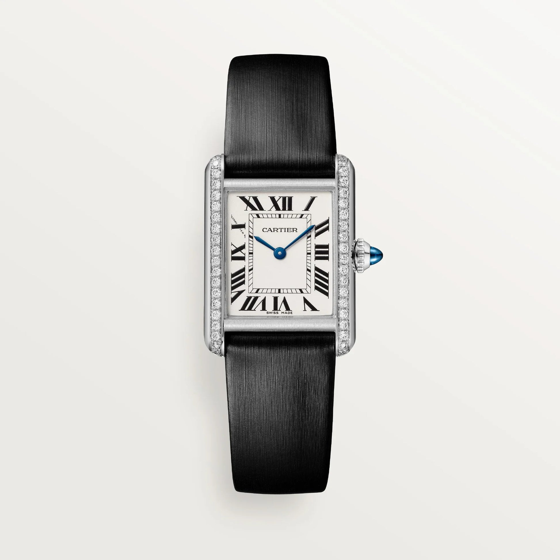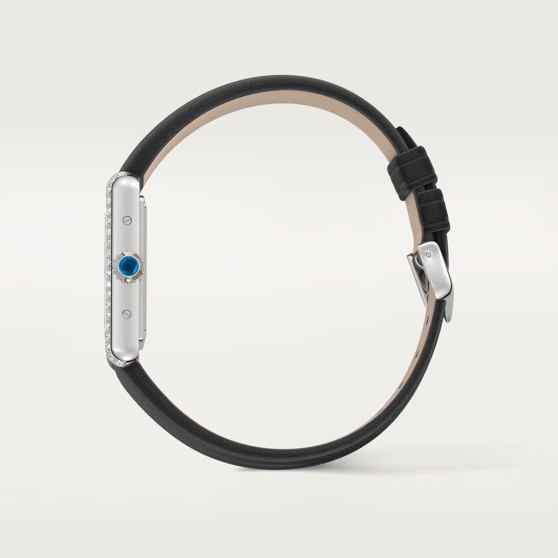 Tank Must watch, small model, high autonomy quartz movement. Steel case, bezel set with 40 brilliant-cut diamonds totaling 0.39 carats, beaded crown set with a synthetic cabochon-shaped spinel, silvered dial, blued-steel sword-shaped hands, interchangeable black brushed calfskin strap, steel ardillon buckle. Case dimensions: 29.5 mm x 22 mm, thickness: 6.6 mm. Water-resistant up to 3 bar (approx. 30 meters/100 feet).