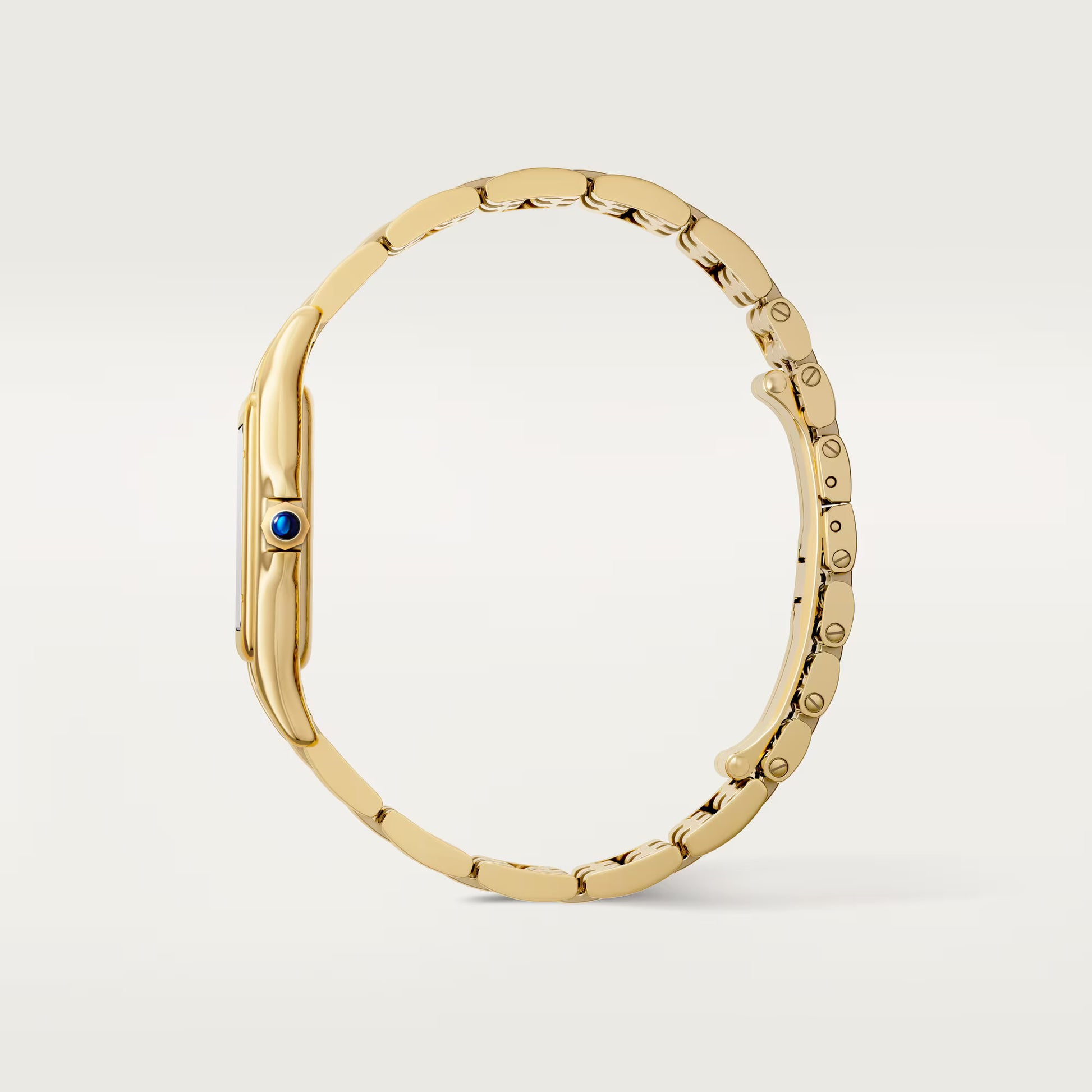 Panthère de Cartier watch, large model, quartz movement. 18K yellow gold (750/1000) case. Dimensions: 31 mm x 42 mm, thickness: 6.71 mm, crown with a blue sapphire, silvered dial, blued-steel sword-shaped hands, 18K yellow gold (750/1000) bracelet. Water-resistant up to 3 bar (approx. 30 meters/100 feet).
