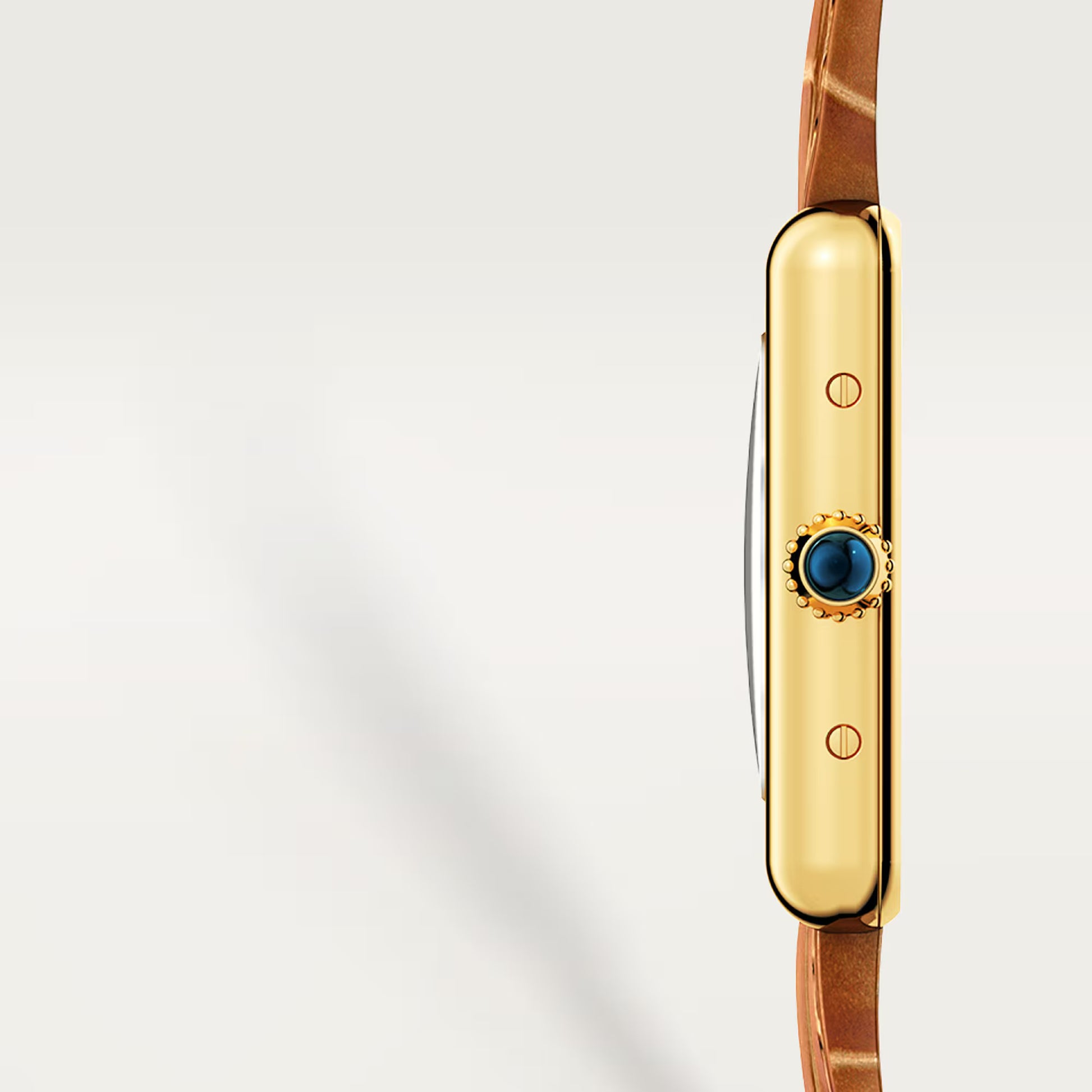 Tank Louis Cartier watch, small model, quartz movement. 18K yellow gold (750/1000) case, beaded crown set with a sapphire cabochon, silver-grained dial, blued-steel sword-shaped hands, mineral crystal, alligator-skin strap 18K yellow gold (750/1000) ardillon buckle. Case dimensions: 29.5 mm x 22 mm, thickness: 6.35 mm. Water-resistant up to 3 bar (30 meters/100 feet).