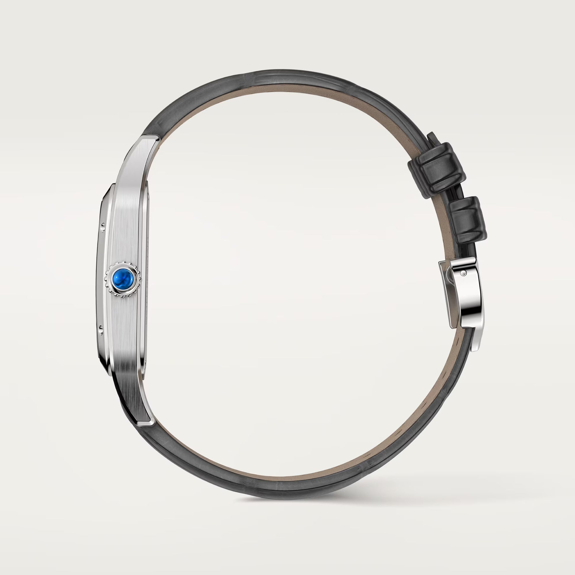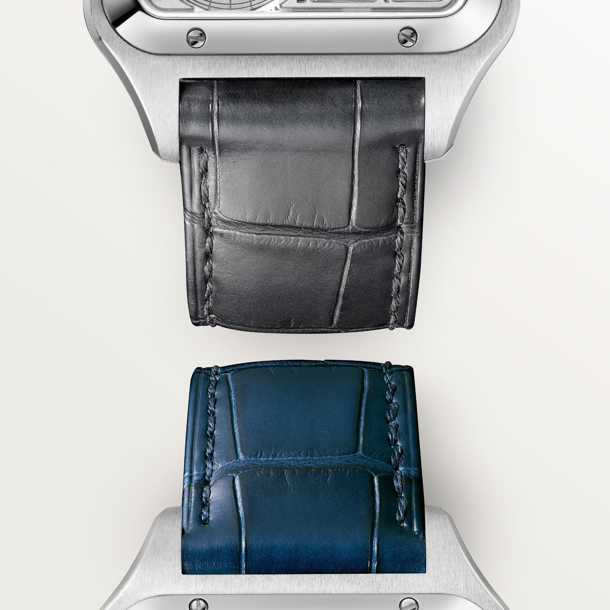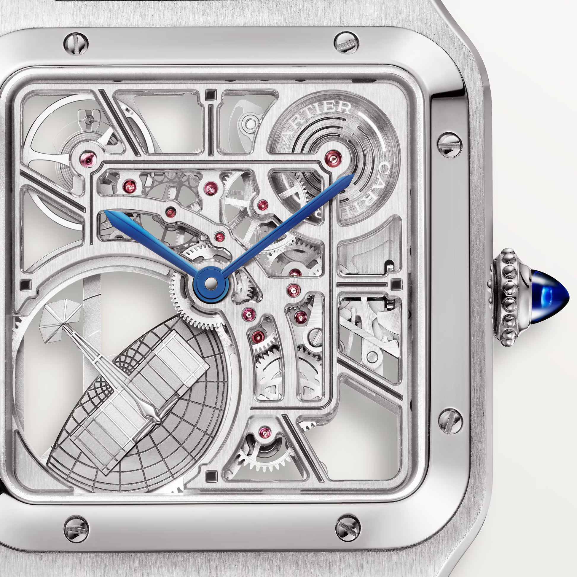 Santos-Dumont micro-rotor skeleton watch, large model, 31 mm, automatic mechanical movement, 9629 MC. Steel case, polished blued-steel sword-shaped hands, sapphire crystal and case back, bridges covered in gray lacquer Gray alligator leather strap and blue alligator leather strap, steel ardillon buckle. Movement dimensions: 23.2 mm, movement thickness: 4.4 mm, balance: 25,200 vibrations/hour, power reserve approx. 46 hours. Case dimensions: 31 mm, thickness: 8 mm. Water-resistant up to 3 bar (approx. 30 meters/100 feet).