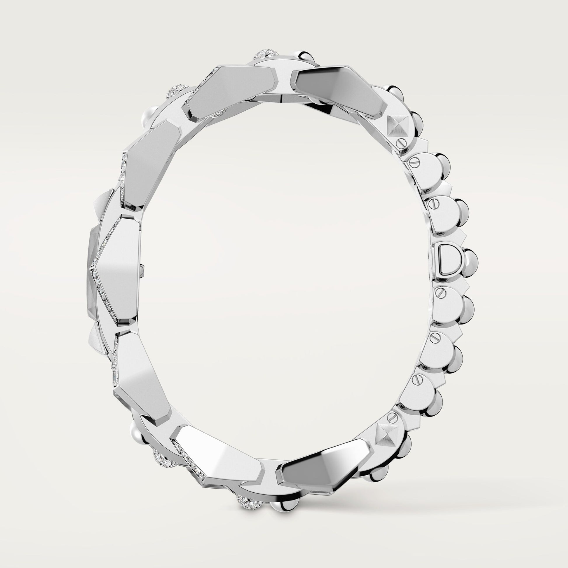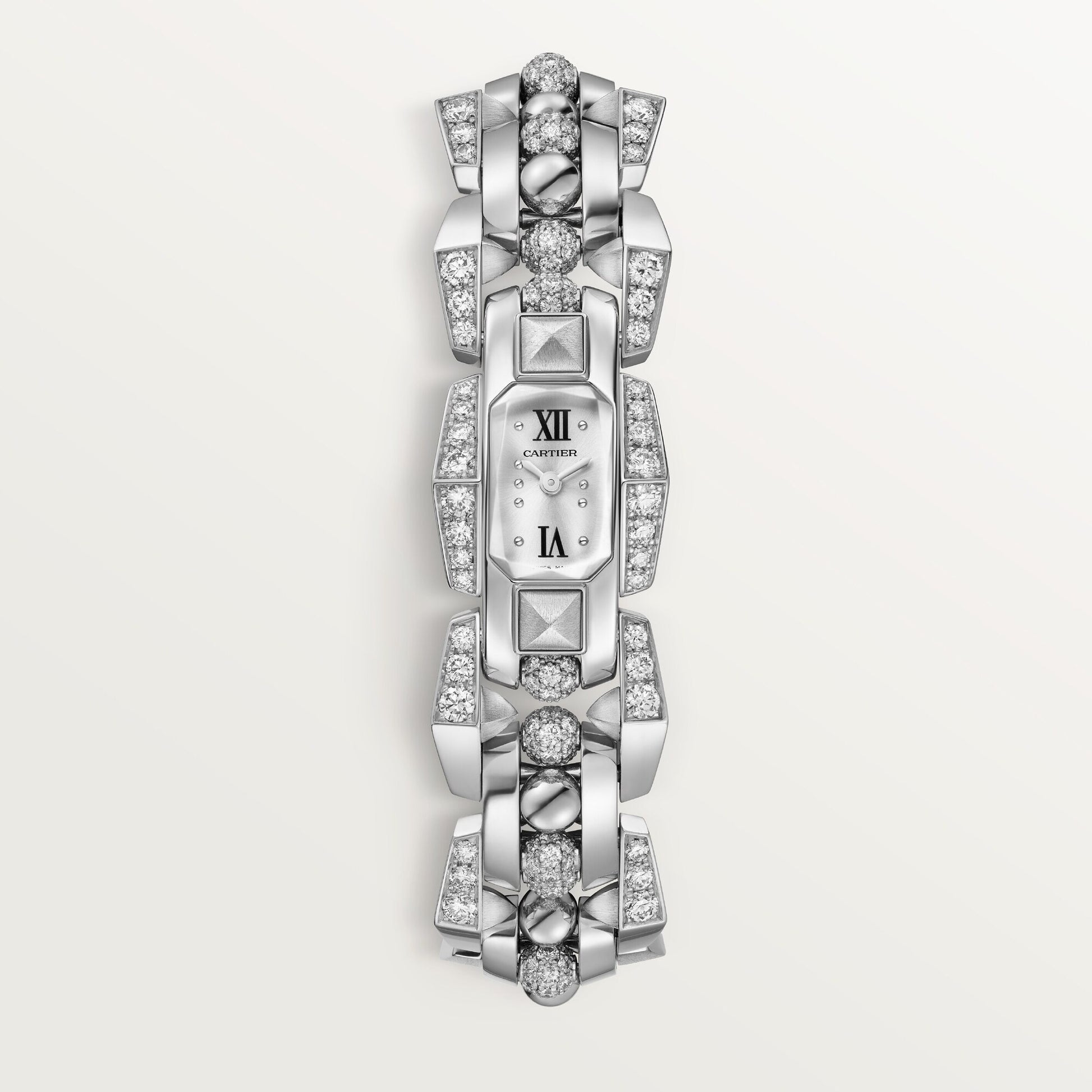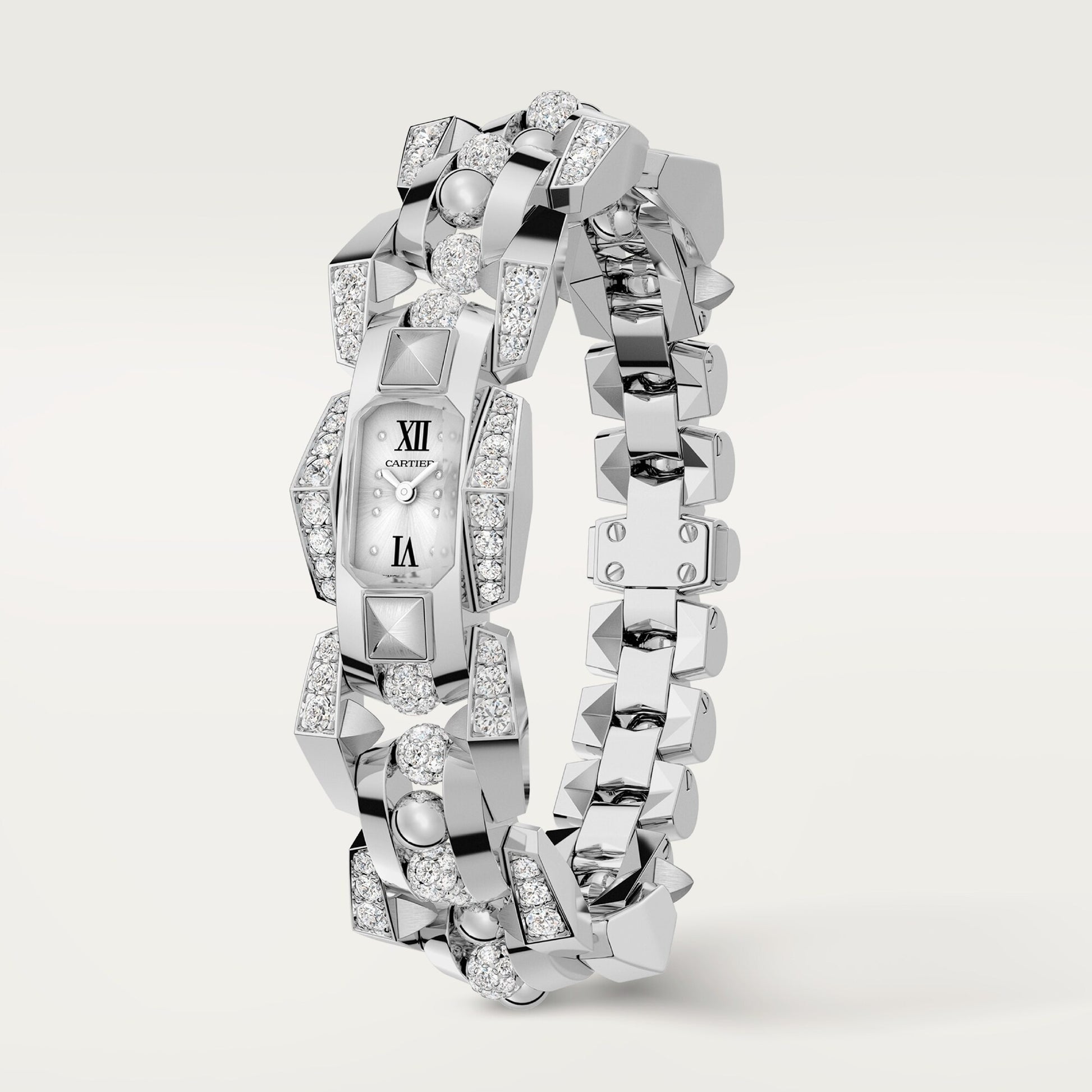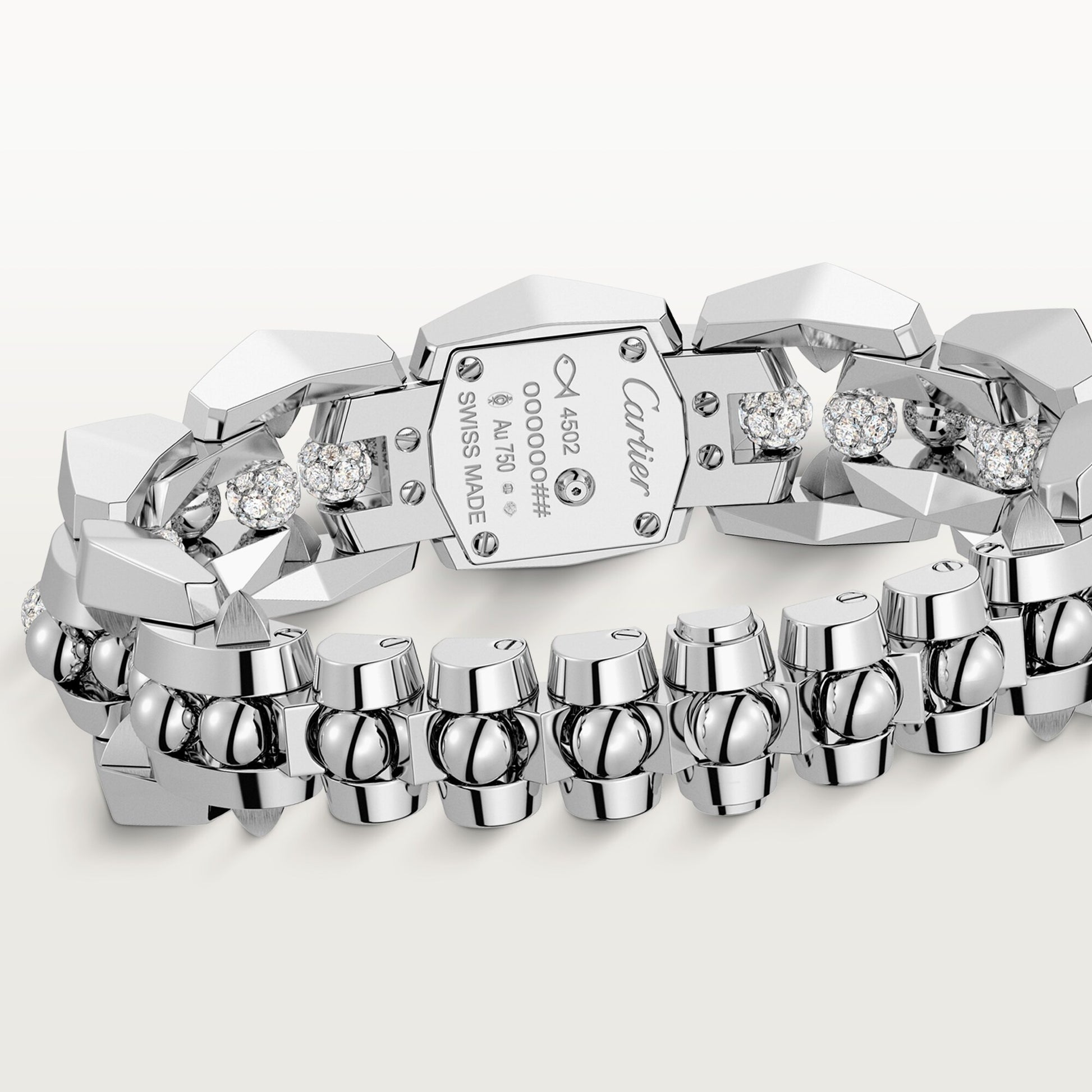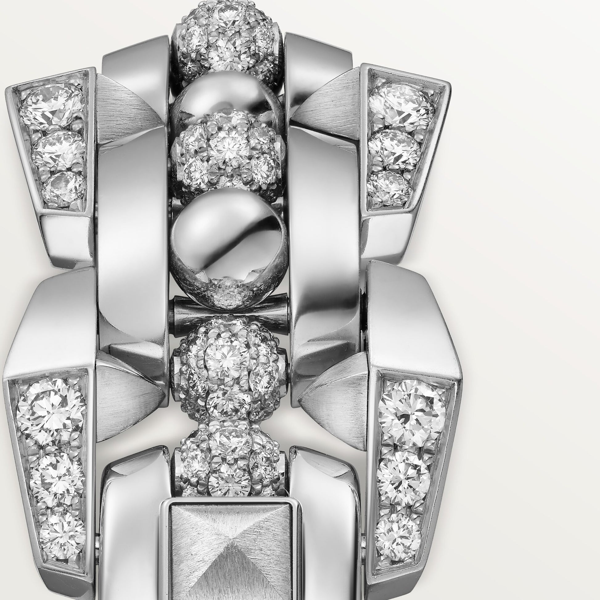 Clash [Un]limited watch, small model, quartz movement. Rhodiumized 18K white gold (750/1000) case set with 58 brilliant-cut diamonds totaling 0.97 carats. Rhodiumized 18K white gold (750/1000) bracelet set with 192 brilliant-cut diamonds totaling 2.89 carats. Silvered sunray dial, rhodiumized steel sword-shaped hands, sapphire crystal. Case dimensions: 18.4 mm x 32.7 mm, 8.1 mm thick. Water-resistant up to 3 bar (approx. 30 meters/100 feet).