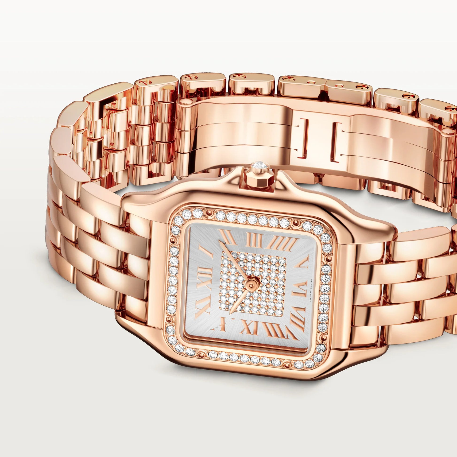 Panthère de Cartier watch, medium model, quartz movement. 18K rose gold (750/1000) case set with 44 brilliant-cut diamonds totaling 0.28 carats. Dimensions: 36.5 mm x 26.7 mm, thickness: 6.8 mm. 18K rose gold (750/1000) octagonal crown set with a brilliant-cut diamond totaling 0.02 carats. Silvered sunray-brushed dial set with 60 brilliant-cut diamonds totaling 0.22 carats, rose gold-finish sword-shaped hands. 18K rose gold (750/1000) bracelet. Water-resistant up to 3 bar (approx. 30 meters/100 feet).